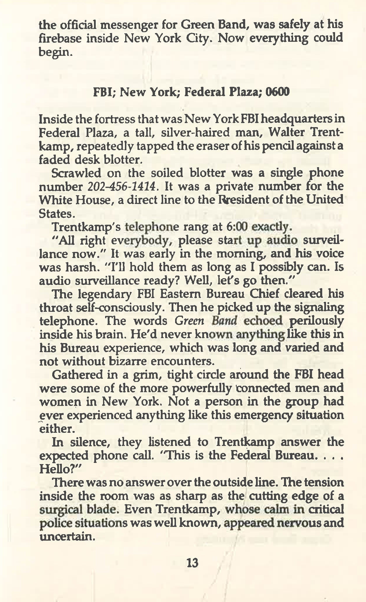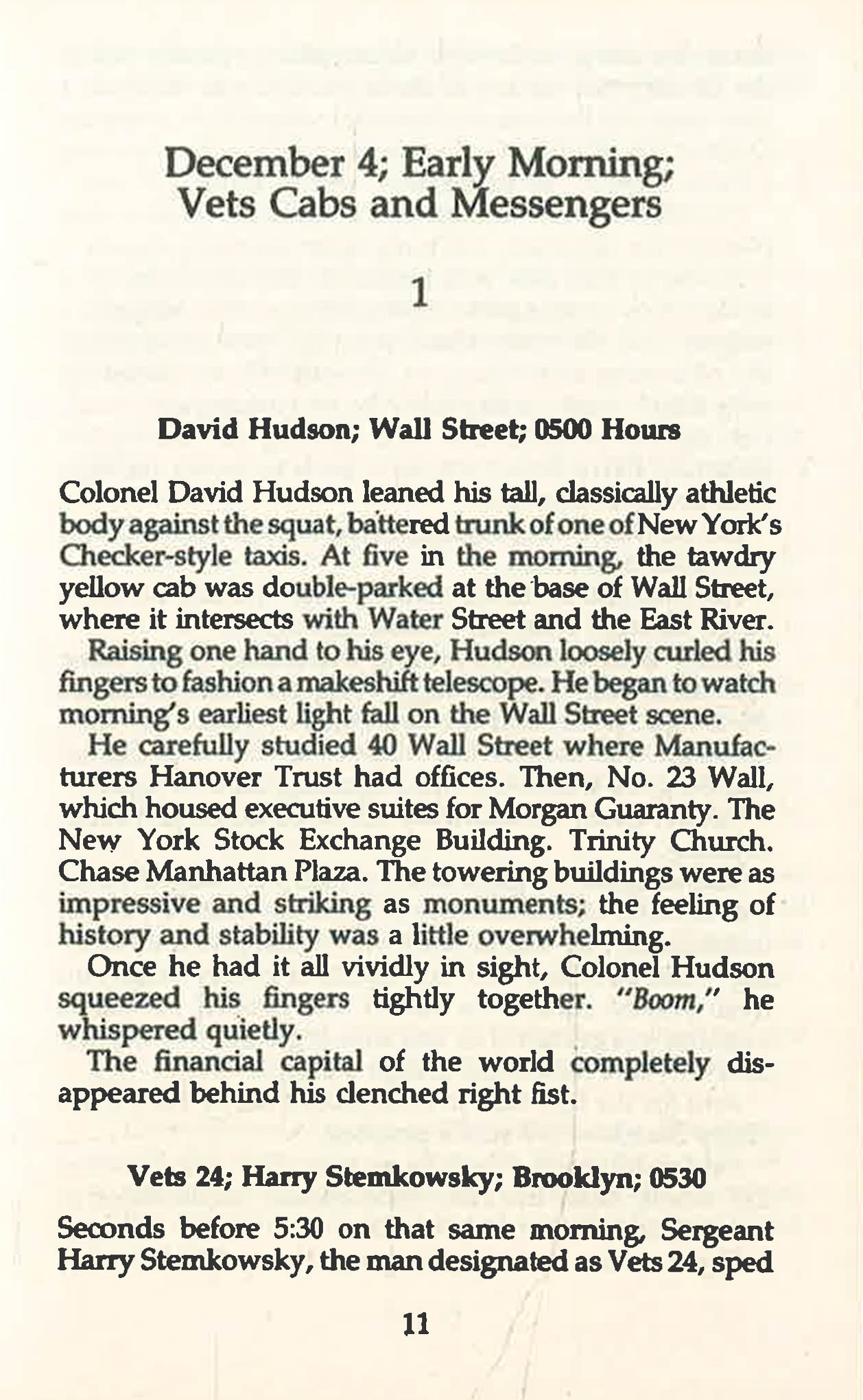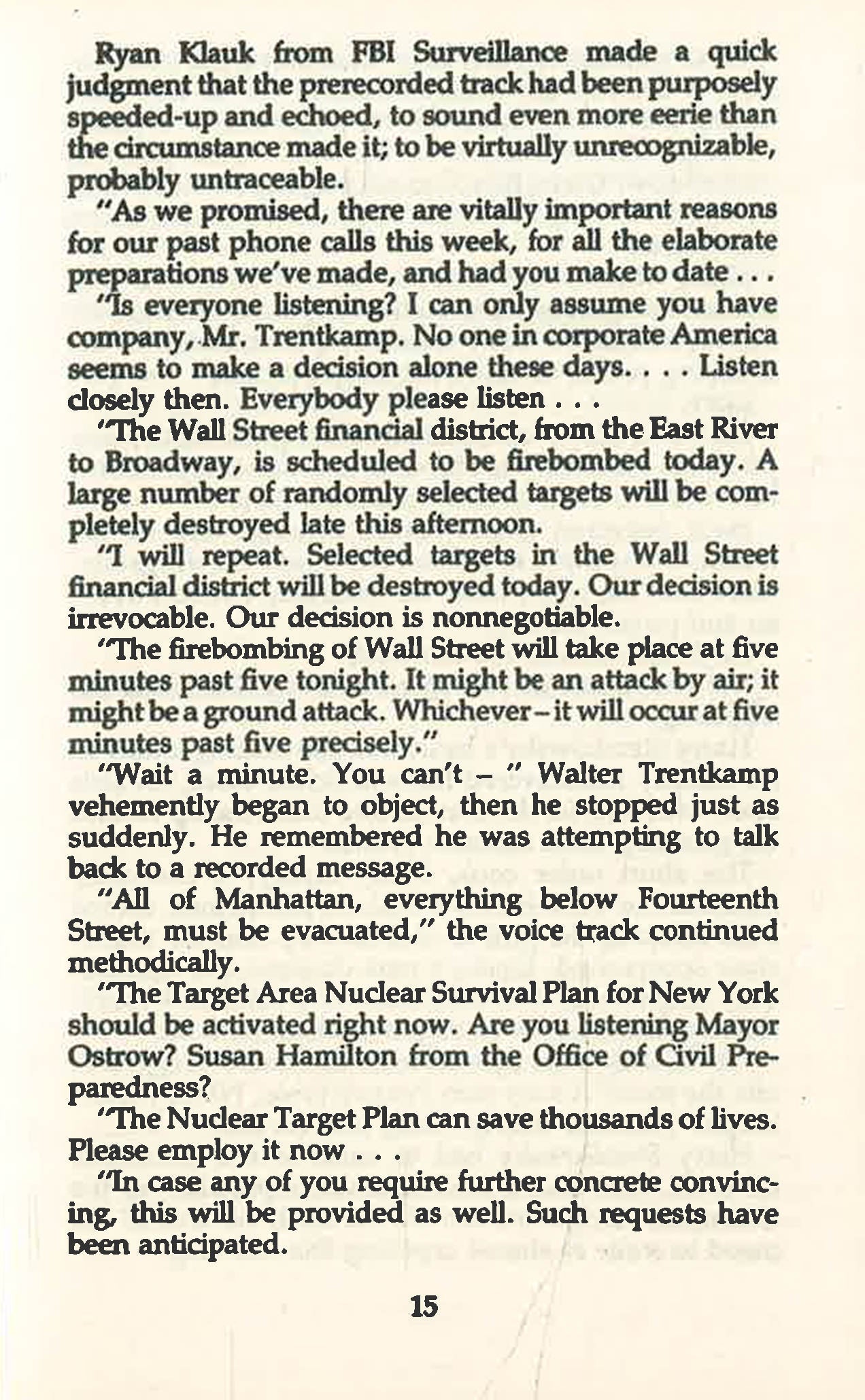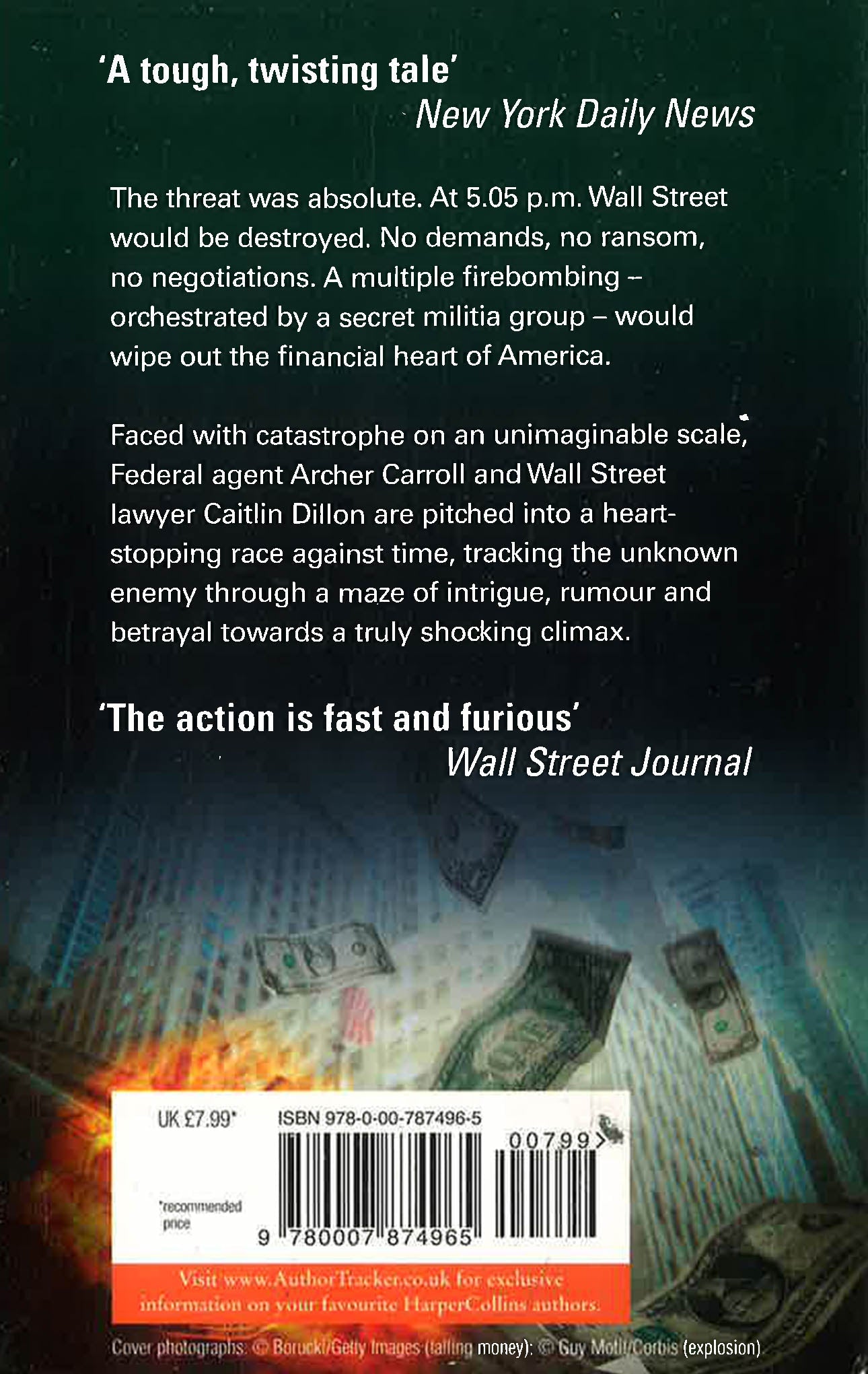 Federal agent Archer Carroll and Wall Street lawyer Caitlin Dillon are pitched into a heart-stopping race against time. At 5.05 p.m. Wall Street would be firebombed. A secret militia group with no demands, no ransom and no negotiations threatens to wipe out the financial heart of America. The pair must track the enemy through a maze of rumour, intrigue and betrayal towards a truly shocking climax.
