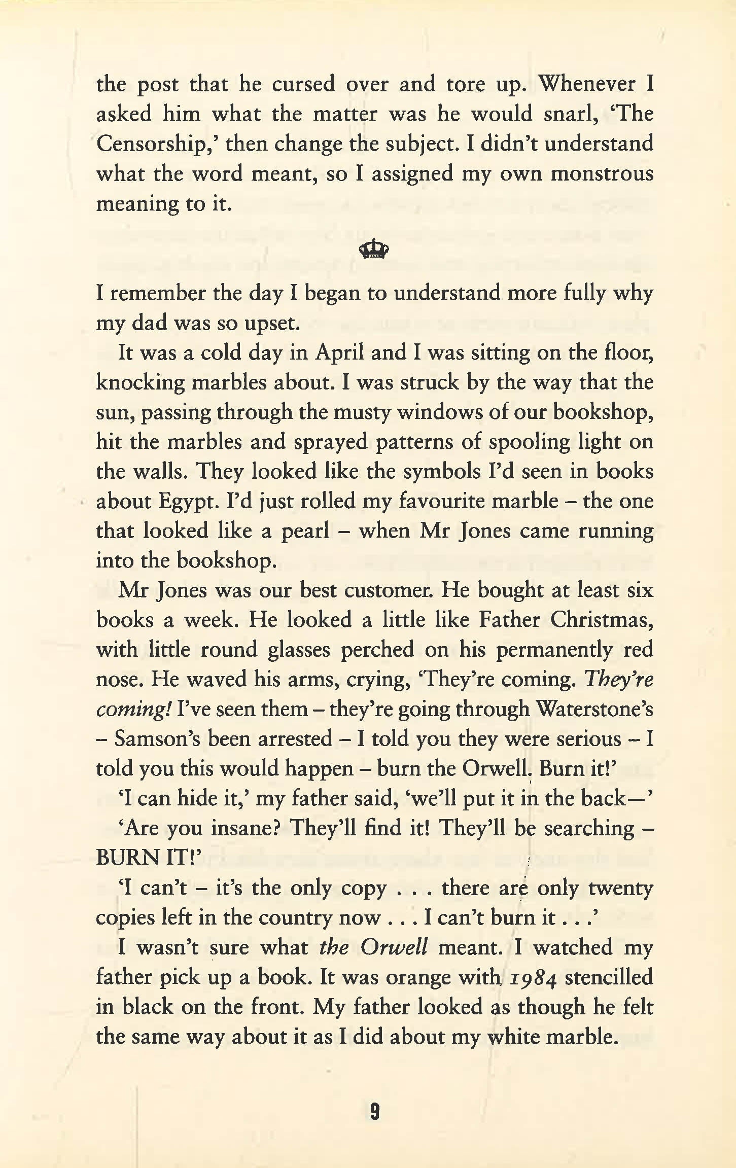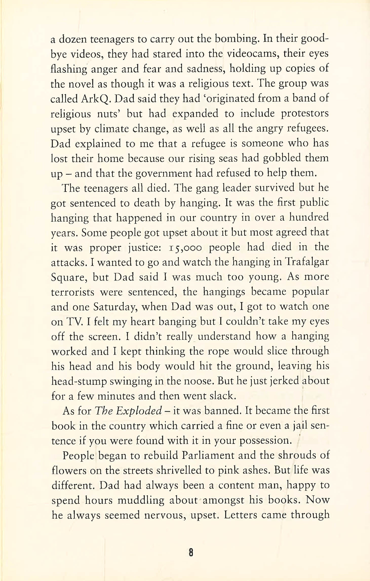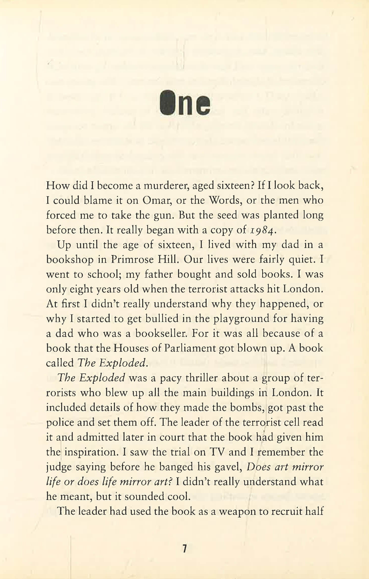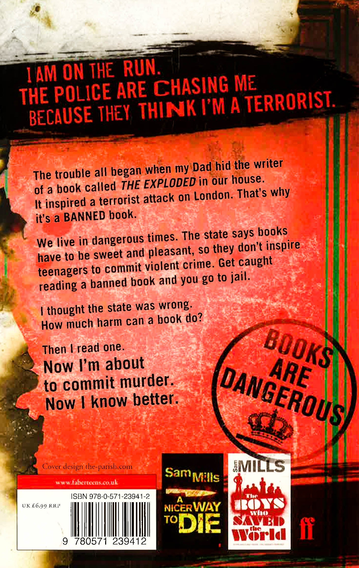 I am on the run. The police are chasing me because they think I'm a terrorist. The trouble all began when my Dad, who's a bookseller, hid a writer called Omar Shakir in our house. Omar wrote a book you may have heard of but won't have read. It's called The Exploded. It inspired a terrorist attack on London. That's why it's a BANNED book. We live in dangerous times. Lots of books are banned now. Harry Potter. Alex Rider. James Bond. If you're caught reading one, you could go to jail. The state says books and films and computer games have to be nice and happy, so they don't inspire teenagers to commit violent crime or terrorism. I thought they were wrong. I thought, how much harm can a book do? Then I read one. Now I'm about to commit murder. Now I know better. BOOKS ARE DANGEROUS.