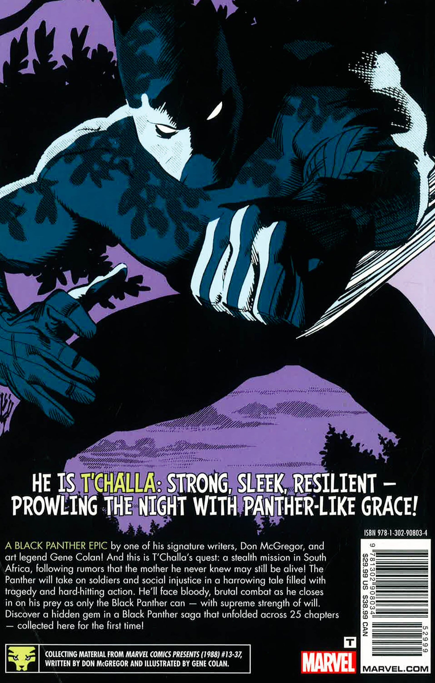 A Black Panther epic by one of his signature writers, Don McGregor, and true artistic legend Gene Colan! He is T'Challa, strong, sleek, resilient - prowling the night with panther-like grace! And this is his quest - a stealth mission in South Africa, following rumors that the mother he never knew may still be alive! The Panther will take on soldiers and social injustice in a harrowing tale filled with tragedy and hard-hitting action. He'll face bloody, brutal combat as he closes in on his prey as only the Black Panther can - with supreme strength of will. Discover a hidden gem in a Black Panther saga that unfolded across 25 chapters - collected here for the very first time!