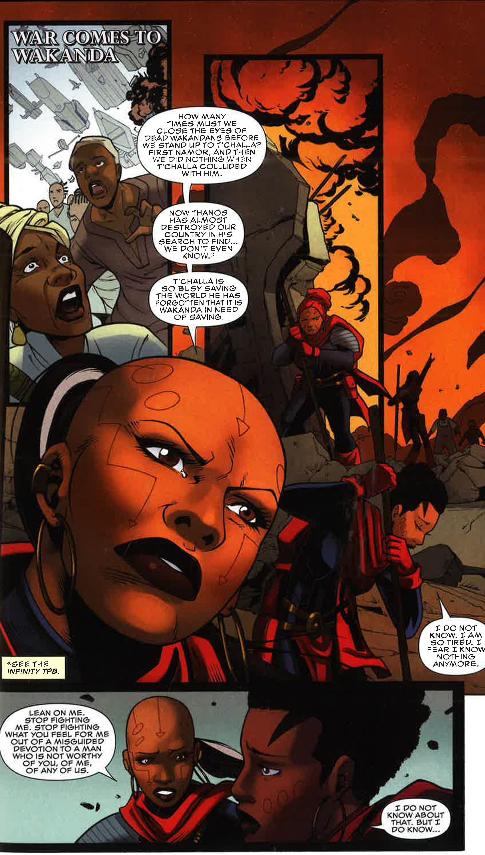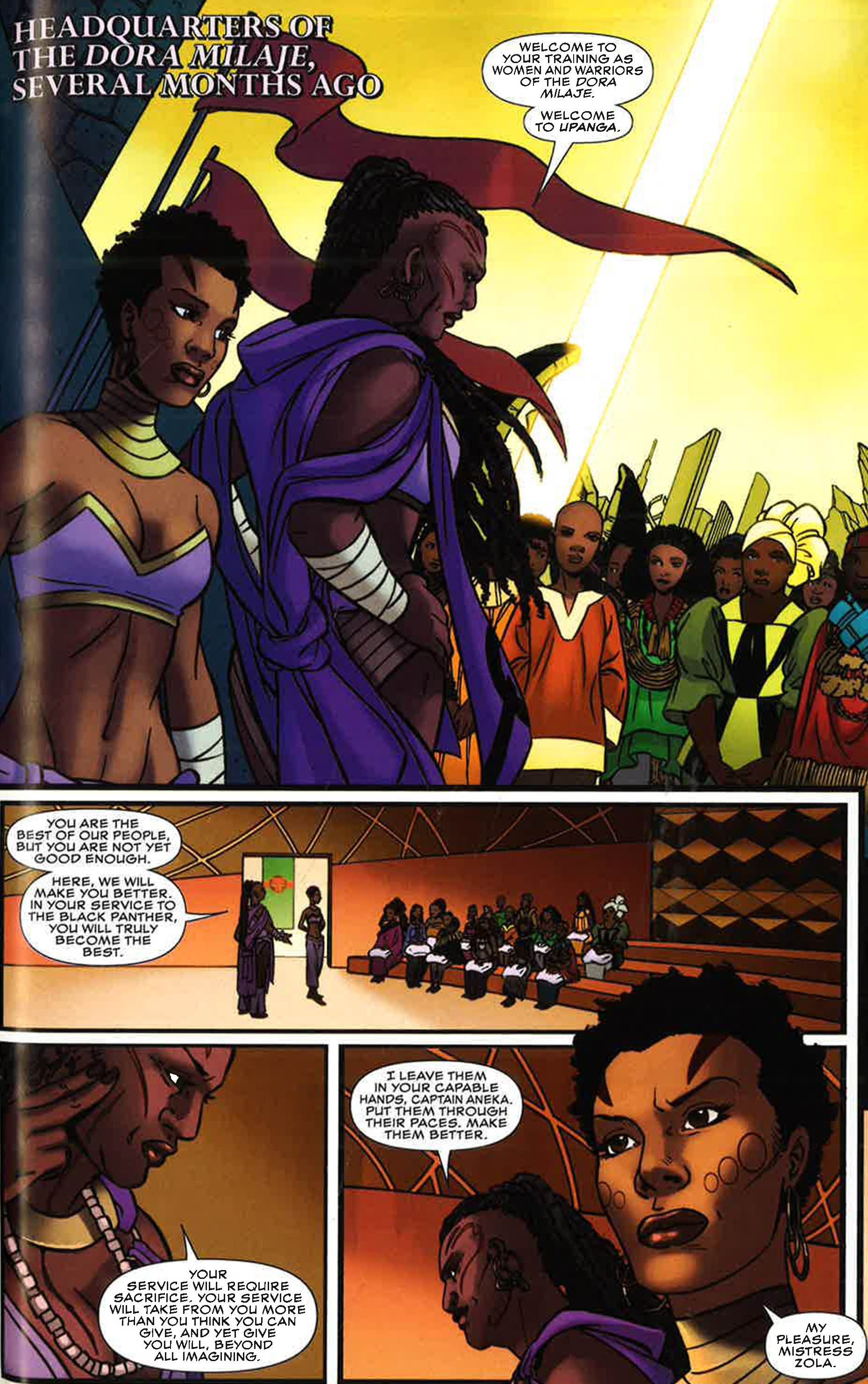 The world building of Wakanda continues in a love story where tenderness is matched only by brutality! You know them now as the Midnight Angels, but in this story they are just Ayo and Aneka, young women recruited to become Dora Milaje, an elite task force trained to protect the crown of Wakanda at all costs. Their first assignment will be to protect Queen Shuri... but what happens when your nation needs your hearts and minds, but you already gave them to each other? Meanwhile, former king T'Challa lies with bedfellows so dark, disgrace is inevitable. Plus, explore the true origins of the People's mysterious leader, Zenzi. Black Panther thinks he knows who Zenzi is and how she got her powers - but he only knows part of the story!