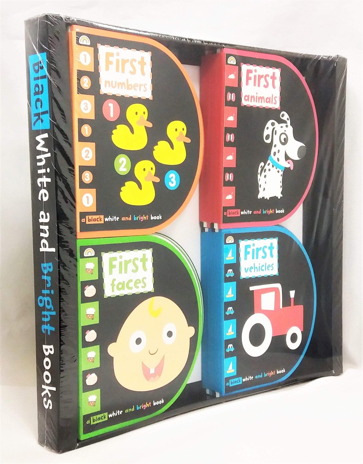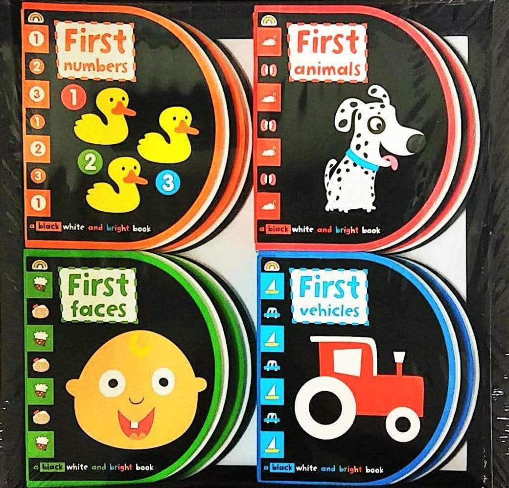 This set of high contrast books has been created as an introduction to simple concepts for babies and toddler. From numbers to animals, and faces to things that go.