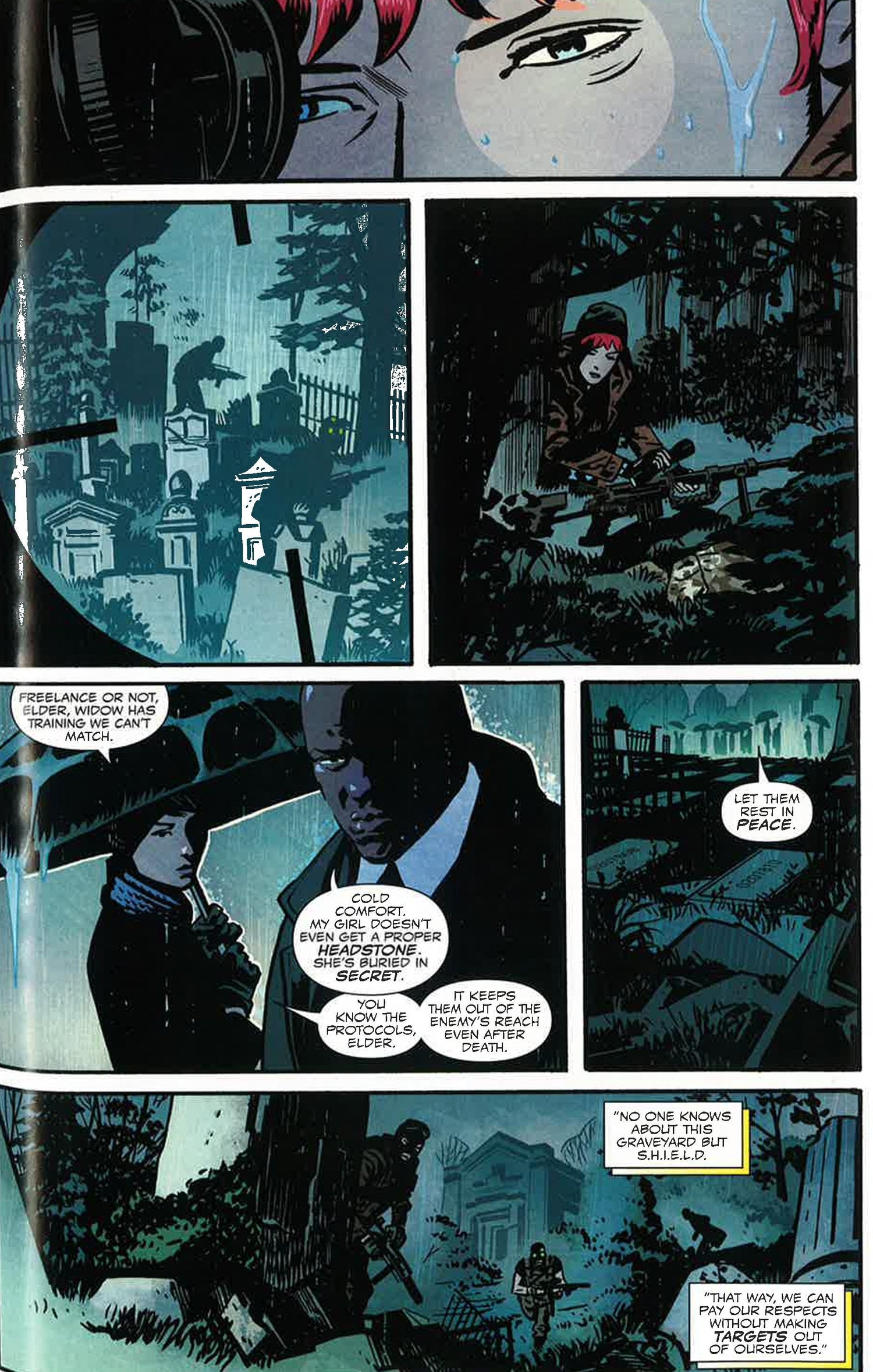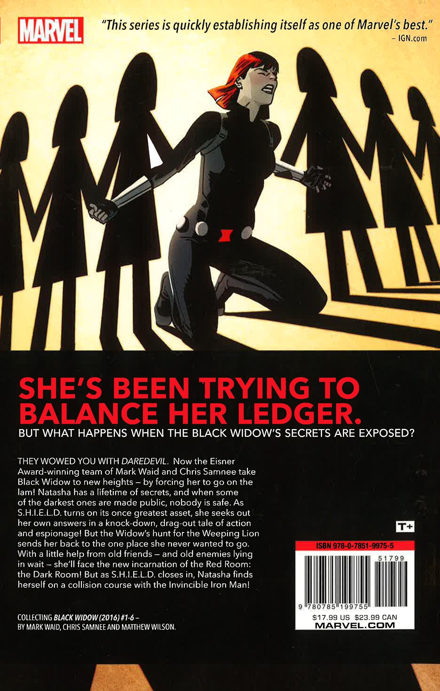 They wowed you with Daredevil, now the Eisner Award-winning team of Mark Waid and Chris Samnee take Black Widow to new heights -by forcing her to go on the lam! Natasha has a lifetime of secrets, and when some of the darkest ones are made public, nobody is safe. As S.H.I.E.L.D. turns on its once greatest asset, she seeks out her own answers in a knockdown drag-out tale of action and espionage! But will the Widow's hunt for the Weeping Lion send her back to the one place she never wanted to go? And, when a S.H.I.E.L.D. funeral makes the assembled top brass an attractive target, it's lucky for them that the Black Widow is still on their side, even if they aren't on hers.