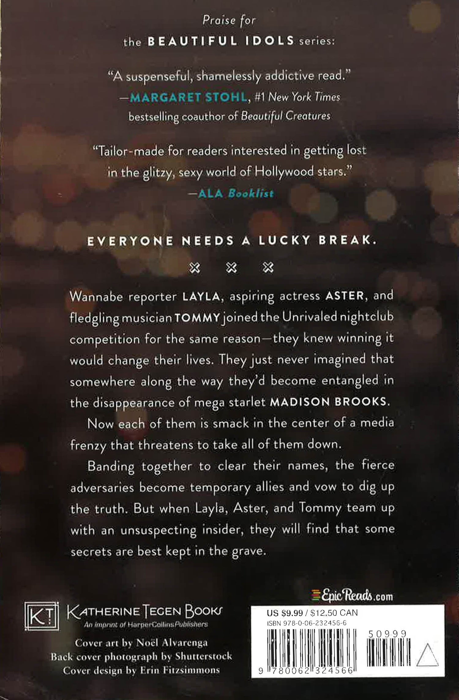 Wannabe reporter LAYLA, aspiring actress ASTER, and fledgling musician TOMMY joined the Unrivaled nightclub competition for the same reason—they knew winning it would change their lives. They just never imagined that somewhere along the way they’d become entangled in the disappearance of mega starlet MADISON BROOKS.Now each of them is smack in the center of a media frenzy that threatens to take all of them down.Banding together to clear their names, the fierce adversaries become temporary allies and vow to dig up the truth. But when Layla, Aster, and Tommy team up with an unsuspecting insider, they will find that some secrets are best kept in the grave.