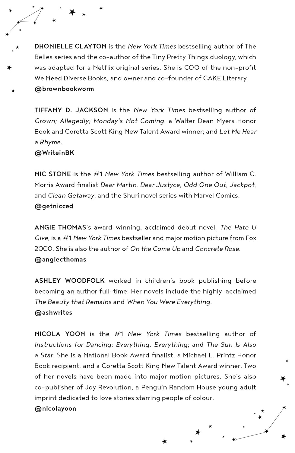 Six of today’s biggest stars of the YA world, Dhonielle Clayton, Tiffany D. Jackson, Nic Stone, Angie Thomas, Ashley Woodfolk, and Nicola Yoon, bring all the electricity of love to a collection of charming, hilarious and heartbreaking tales that shine the brightest light through the dark.