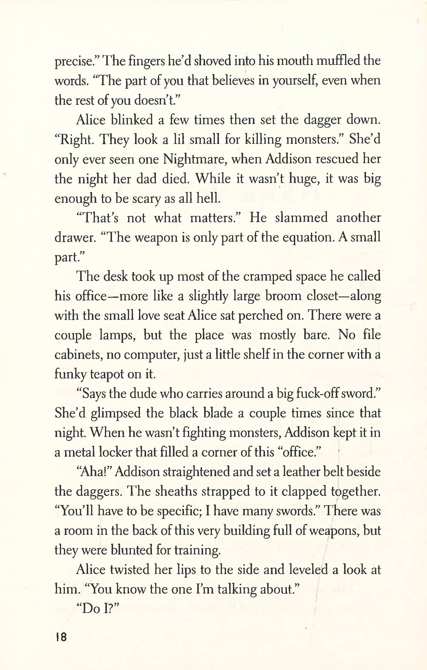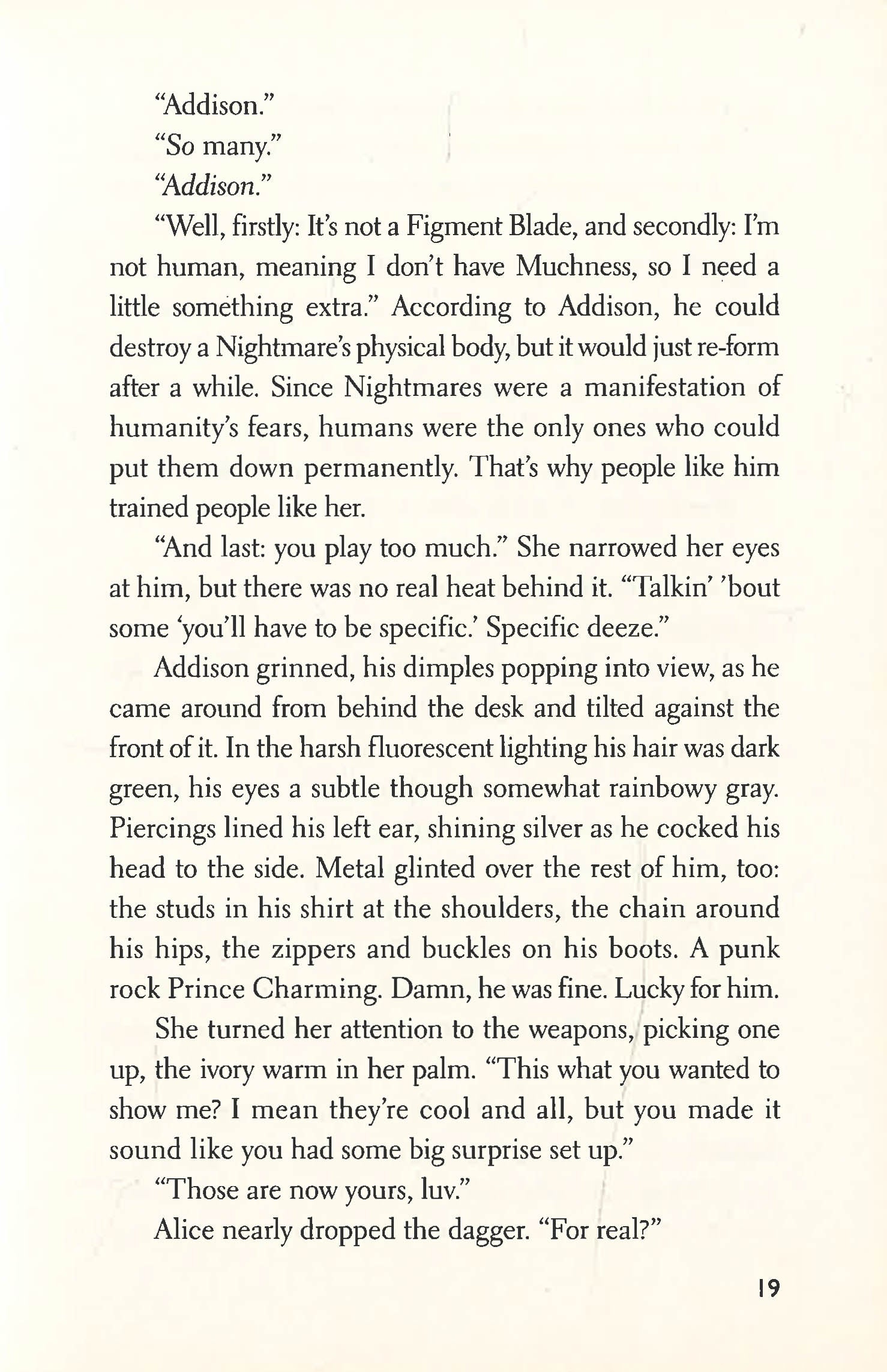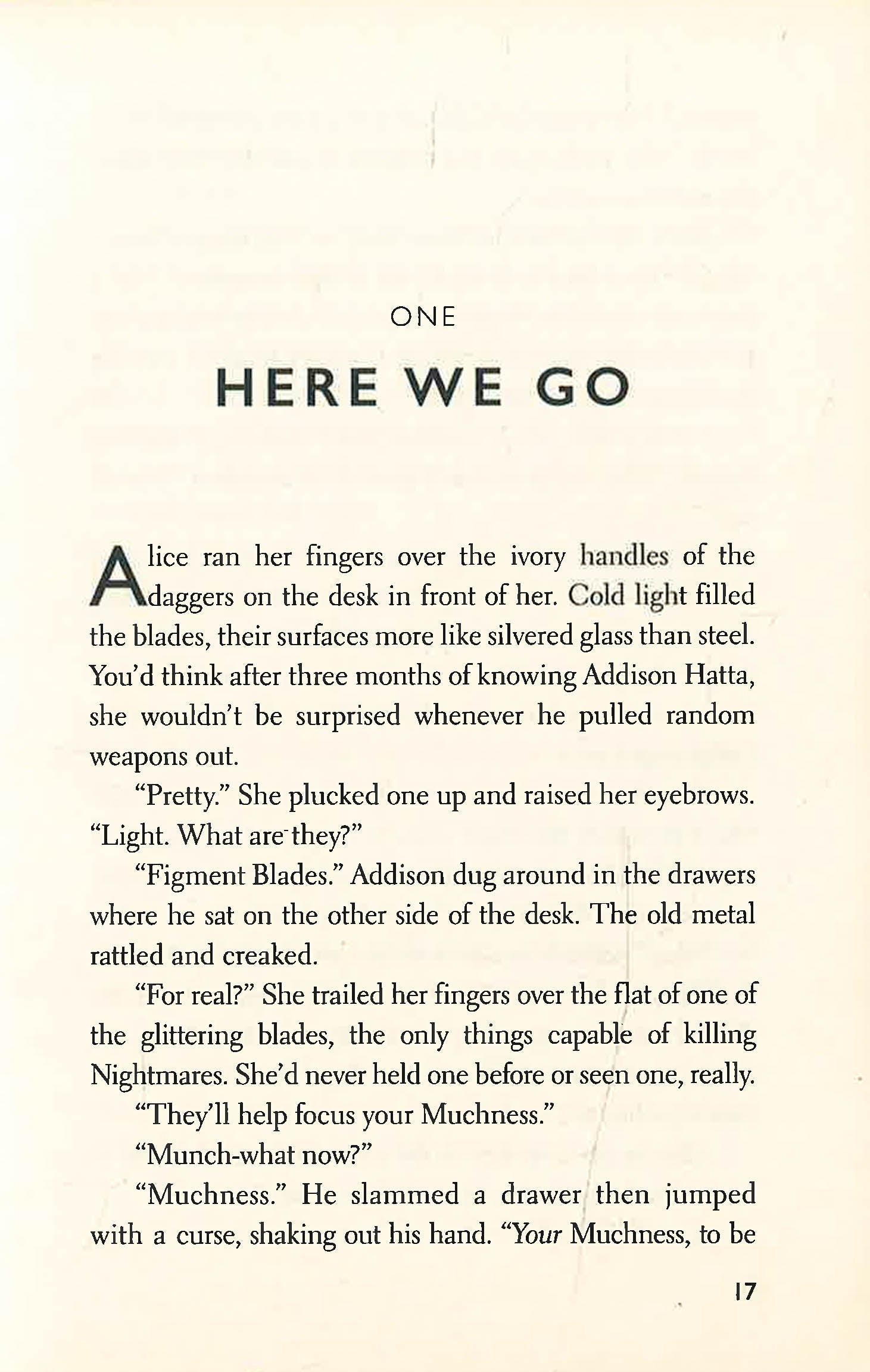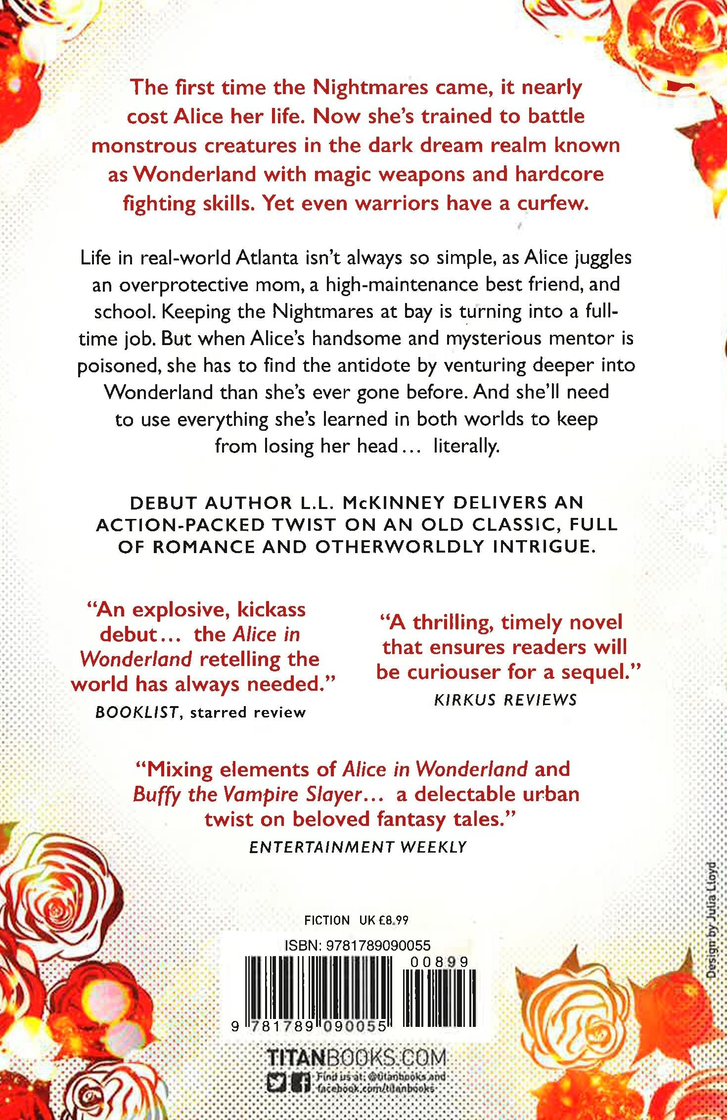 The first time the Nightmares came, it nearly cost Alice her life. Now she's trained to battle monstrous creatures in the dark dream realm known as Wonderland with magic weapons and hardcore fighting skills. Yet even warriors have a curfew. Life in real-world Atlanta isn't always so simple, as Alice juggles an overprotective mom, a high maintenance best friend, and school. Keeping the Nightmares at bay is turning into a full-time job. But when Alice's handsome and mysterious mentor is poisoned, she has to find the antidote by venturing deeper into Wonderland than she's ever gone before. And she'll need to use everything she's learned in both worlds to keep from losing her head...literally.