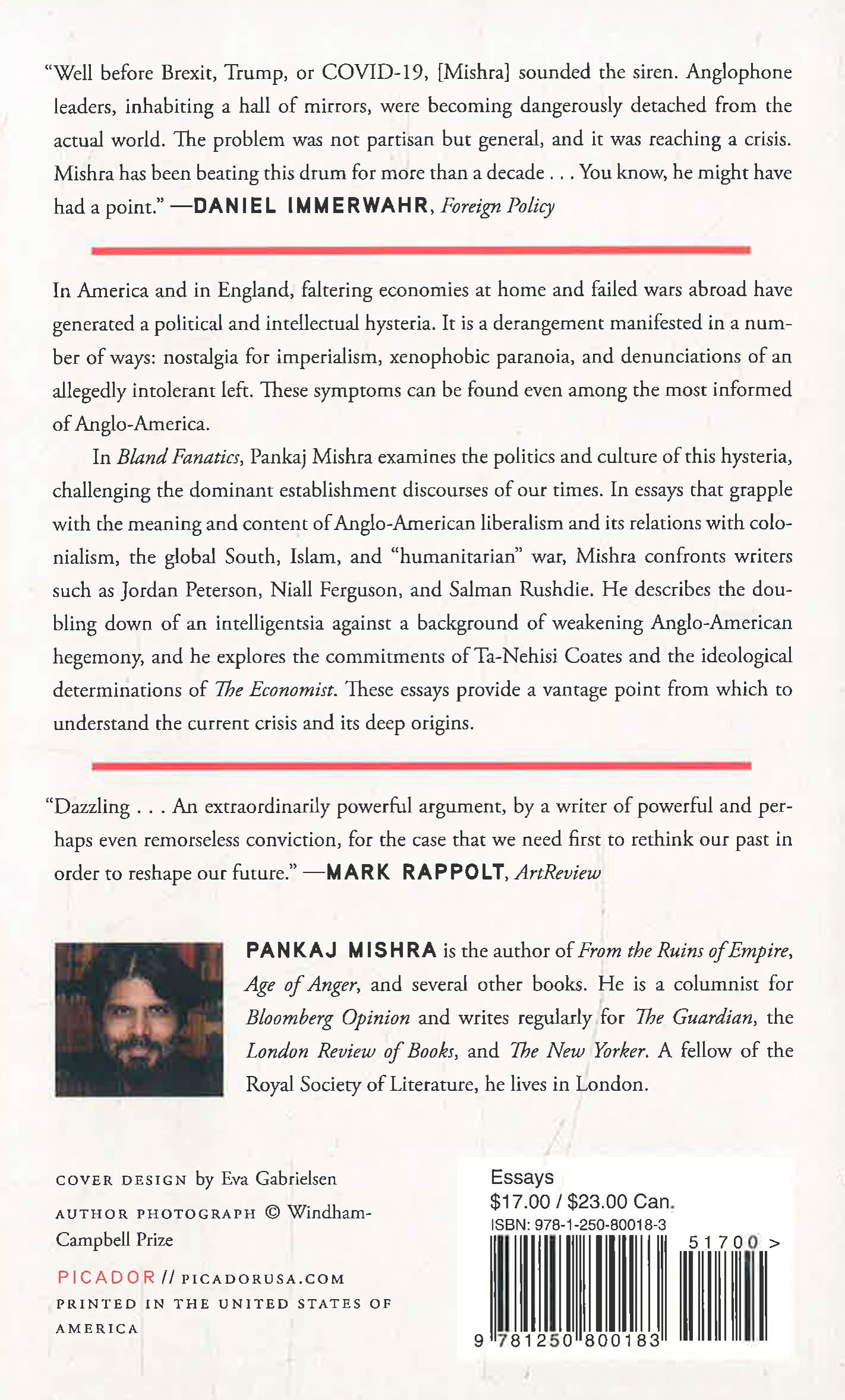 In Bland Fanatics, Pankaj Mishra examines the politics and culture of this hysteria, challenging the dominant establishment discourses of our times. In essays that grapple with the meaning and content of Anglo-American liberalism and its relations with colonialism, the global South, Islam, and “humanitarian” war, Mishra confronts writers such as Jordan Peterson, Niall Ferguson, and Salman Rushdie. He describes the doubling down of an intelligentsia against a background of weakening Anglo-American hegemony, and he explores the commitments of Ta-Nehisi Coates and the ideological determinations of The Economist. These essays provide a vantage point from which to understand the current crisis and its deep origins.