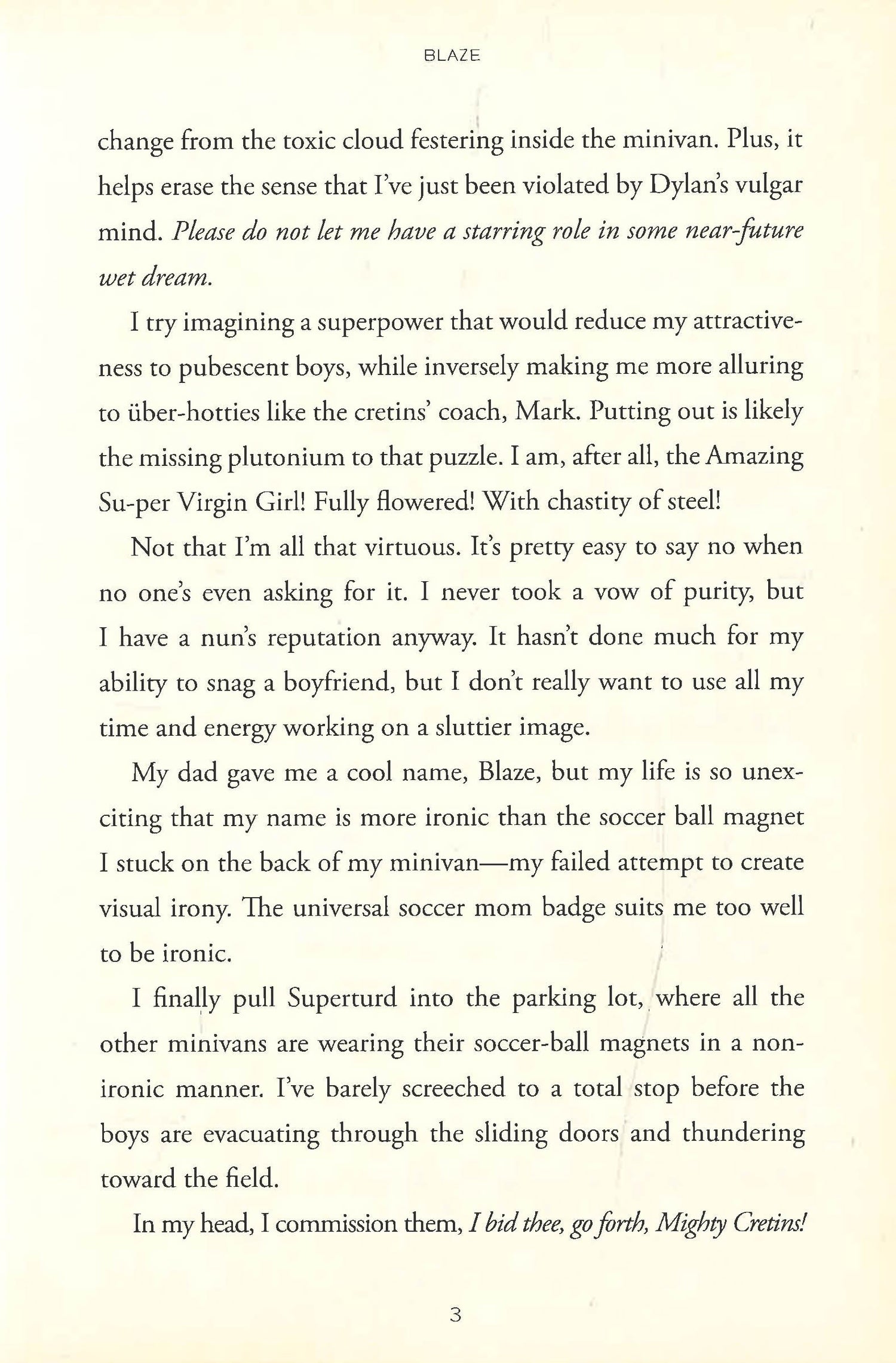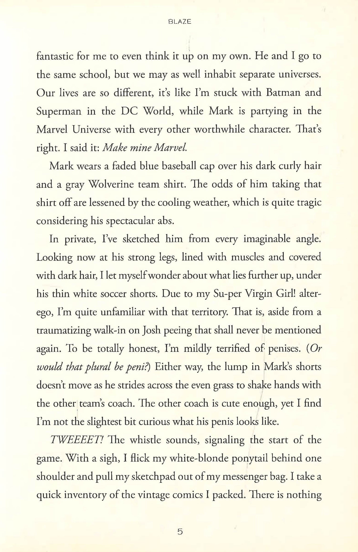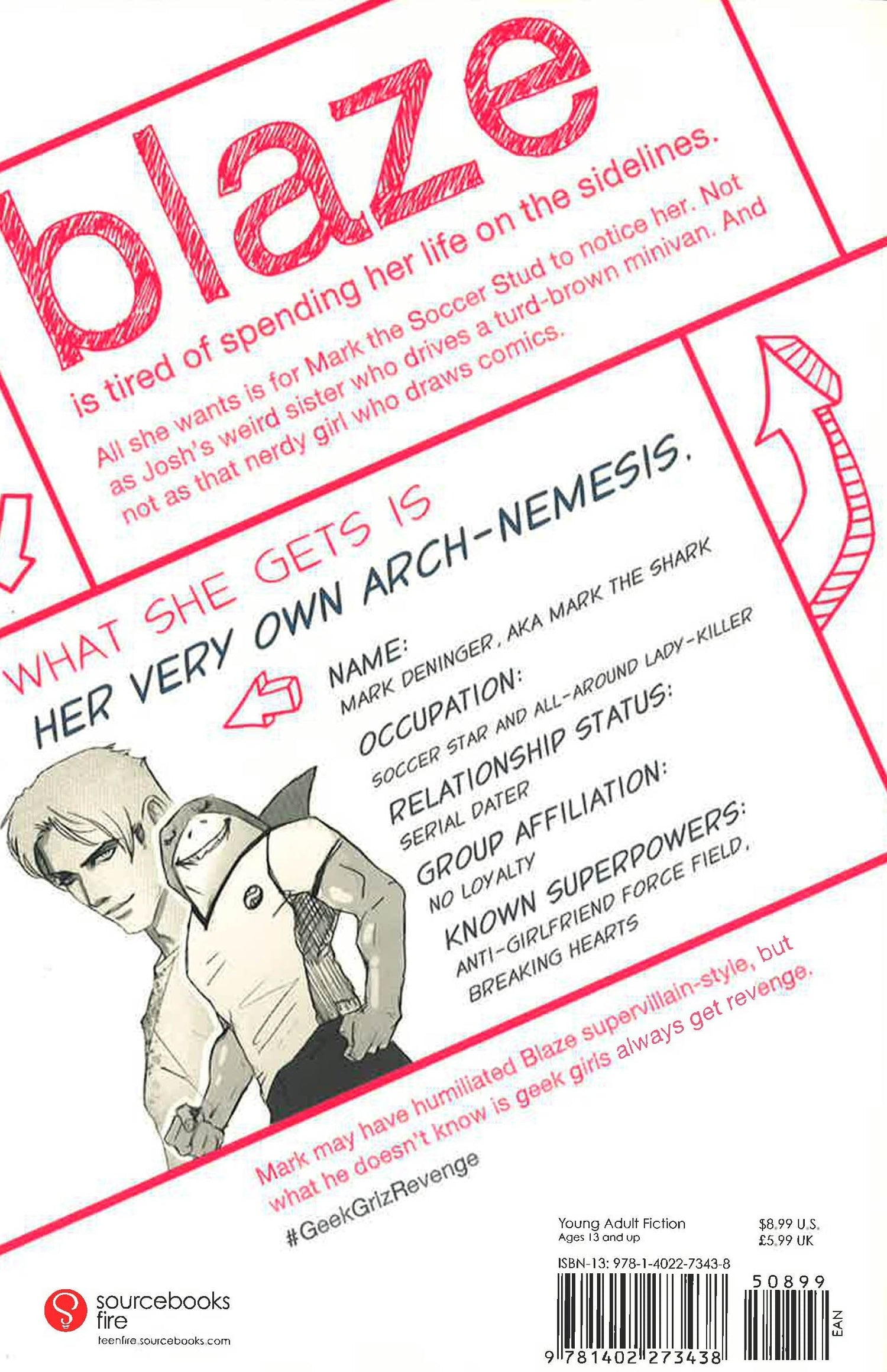 Blaze is tired of spending her life on the sidelines. All she wants is for Mark the Soccer Stud to notice her. Not as Josh's weird sister who drives a turd-brown minivan. And not as that nerdy girl who draws comics. What she gets is her very own arch-nemesis. Name: Mark Deninger, aka Mark the Shark Occupation: Soccer star and all-around lady killer Relationship Status: Serial dater Group Affiliation: No loyalty Known Superpowers: Anti-girlfriend force field, breaking hearts Mark may have humiliated Blaze supervillian-style, but what he doesn't know is how geek girls always get revenge.