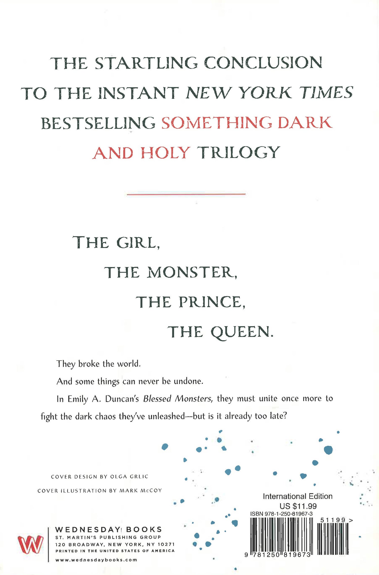 The startling conclusion to the instant New York Times bestselling Something Dark and Holy trilogy The girl, the monster, the prince, the queen. They broke the world. And some things can never be undone. In Emily A. Duncan s Blessed Monsters, they must unite once more to fight the dark chaos they've unleashed - but is it already too late? This edition uses deckle edges; the uneven paper edge is intentional.