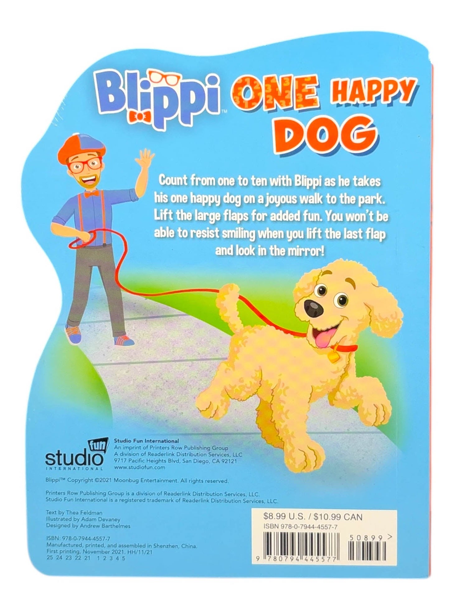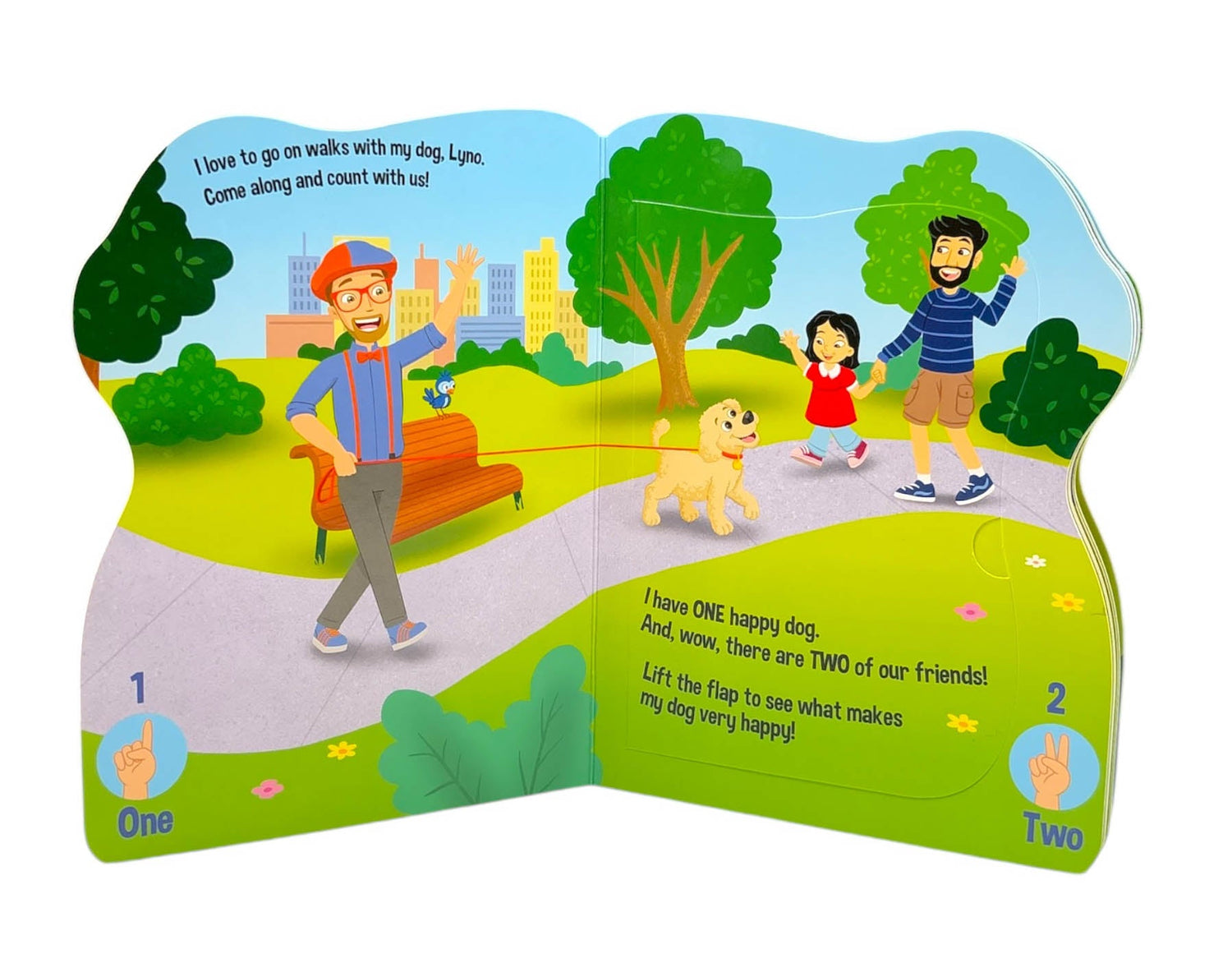 Children can learn to count from 1 to 10 with Blippi as he takes his 1 happy dog on a joyous walk to the park. They see 2 friends, 3 kids, 4 swings, and much more. Lift the large flaps for added fun, and babies won’t be able to resist smiling when they lift the last flap and look in the mirror! In Blippi: One Happy Dog, readers will look for things to count in the art and also see each number written as a word and numeral. There’s even an inset of Blippi holding up fingers for each number to reinforce the learning.
