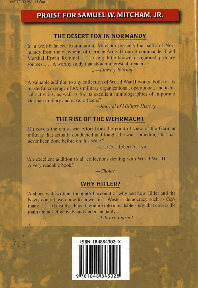 German troops there were entrenched and fought tenaciously in a campaign that would last until 1945.On the Eastern Front, the barbarous warfare of 1941 and 1942 continued unabated--only now the Soviets often had the upper hand, both in numbers and, more and more, in operational ingenuity. Even Manstein could not produce a victory at Kursk, where Soviet T-34s beat German Tigers and Panthers in the largest armour battle in history. Kursk would mark the beginning of Nazi Germany's long and bloody retreat in the East.The Third Reich's defeats were not limited to the ground. At sea, the Allies neutralized the U-boat threat, and in the air, they dominated the 'Luftwaffe' and took the war to the German home front.The war would drag on for two more brutal years, but the end was now in sight. No longer could the Germans mount their feared blitzkrieg; no longer could they win the war. Mitcham chronicles this turning-point year with insight and drama.
