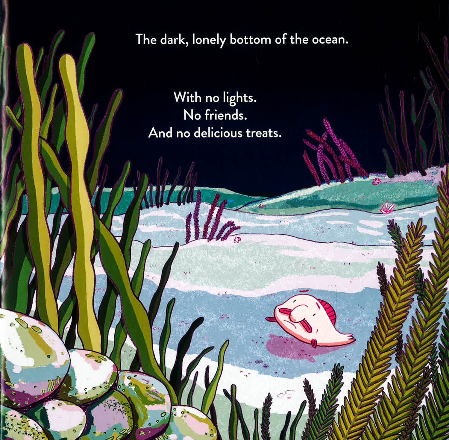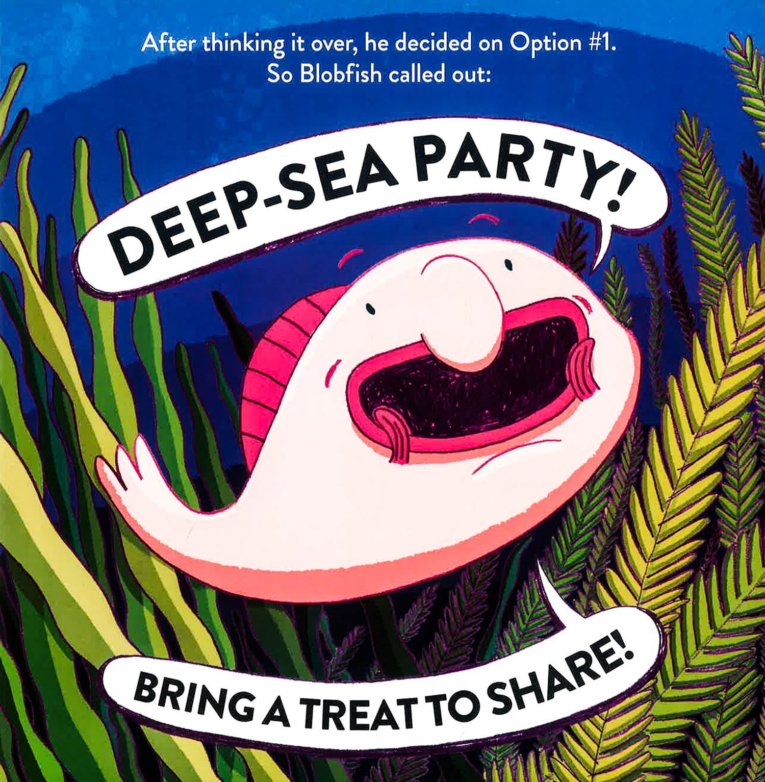 Introducing Blobfish Throws a Party, a wild and hilarious story from award-winning author Miranda Paul! Blobfish lives at the bottom of the ocean with no lights, no friends, and no delicious treats. The only two ways he can think to change this would be to 1) throw a party, or 2) save the world in true hero style. He decides to do the first one. However, when he announces, "Deep sea party! Bring a treat to share!", the mermaids hear "Cheap, free party! Sling on a sheet to wear!", and the shorebirds hear "Cheep-peep party! Sing a tweet with flair!", and so on. Soon the whole world is partying in strange ways based on what they think they heard, and Blobfish is still sad and alone at the bottom of the sea. Will Blobfish ever get his lights, friends, and delicious treats?