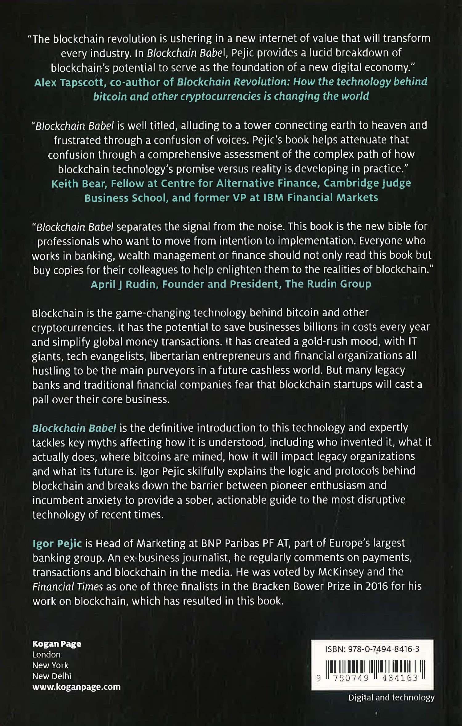WINNER: Independent Press Award 2020 - Technology Category Blockchain is the technology behind bitcoin and other crypto-currencies. According to Santander, it could save financial institutions $15-20bn a year from 2022 onward. Most experts see an unprecedented potential, but many banks, payment processors and credit card companies fret that bitcoin entrepreneurs could cast a pall over their core business. Whatever the position of blockchain, many voices are shouting from different angles, creating a cacophony of confusion including tech-evangelists, anarcho-libertarians and industry experts. But while everybody in IT and banking seems to have an opinion on the blockchain, there is little systematic research, no strategic analysis. Blockchain Babel is the ultimate guide to the most disruptive technology to have entered the finance industry in recent years. Blockchain Babel looks at blockchain alongside innovation diffusion, competitive dynamics and management strategy. Shortlisted as one of the three best business book proposals by McKinsey and the Financial Times for the Bracken Bower Prize in 2016, this is a must-read for business leaders and aspiring leaders wanting to grasp blockchain and put it into context and understand the practical implications it may have.