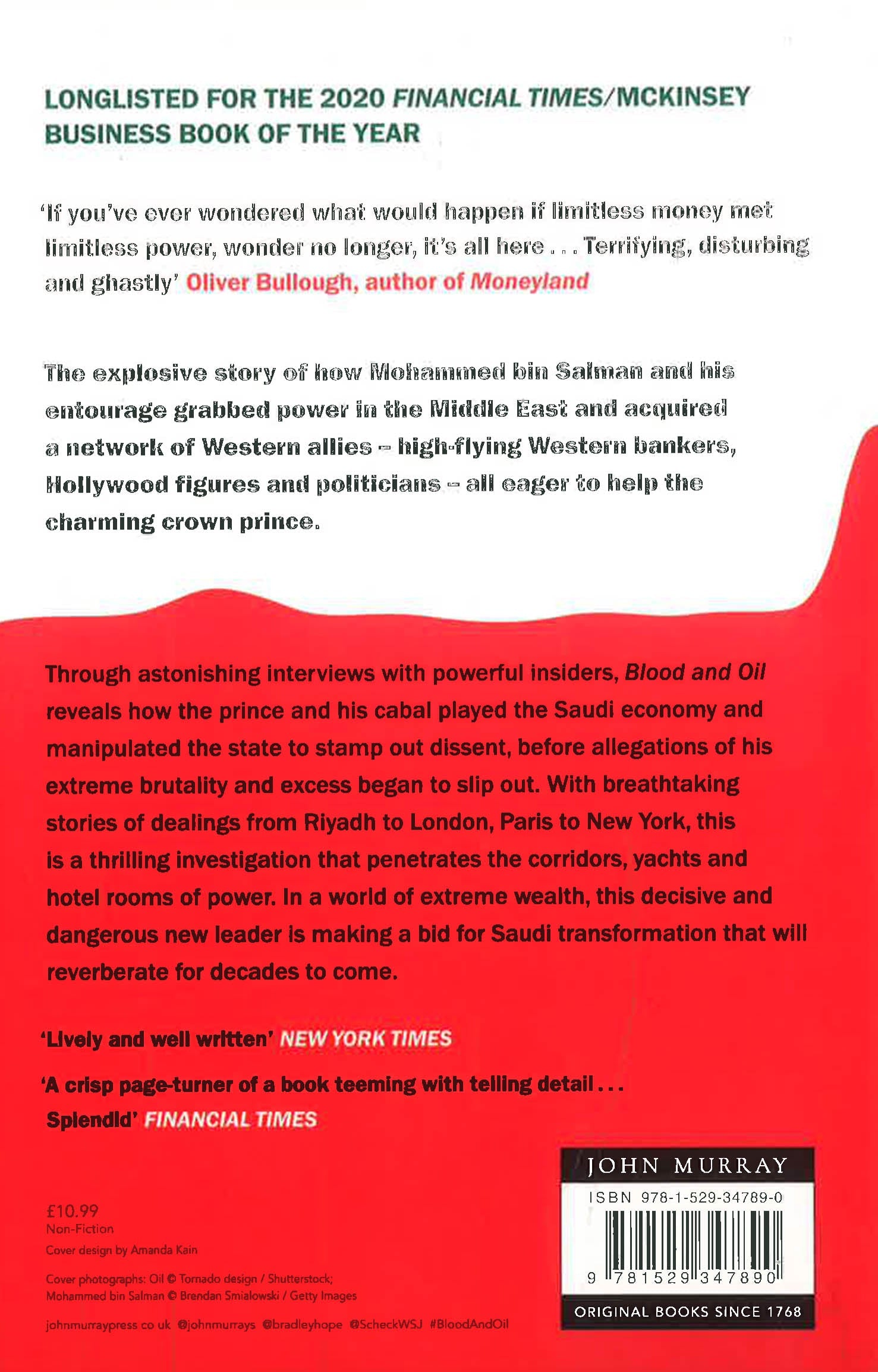 Blood and Oil the explosive untold story of how Mohammed bin Salman and his entourage grabbed power in the Middle East and acquired a network of Western allies - including well-known US bankers, Hollywood figures, and politicians - all eager to help the charming and crafty crown prince.