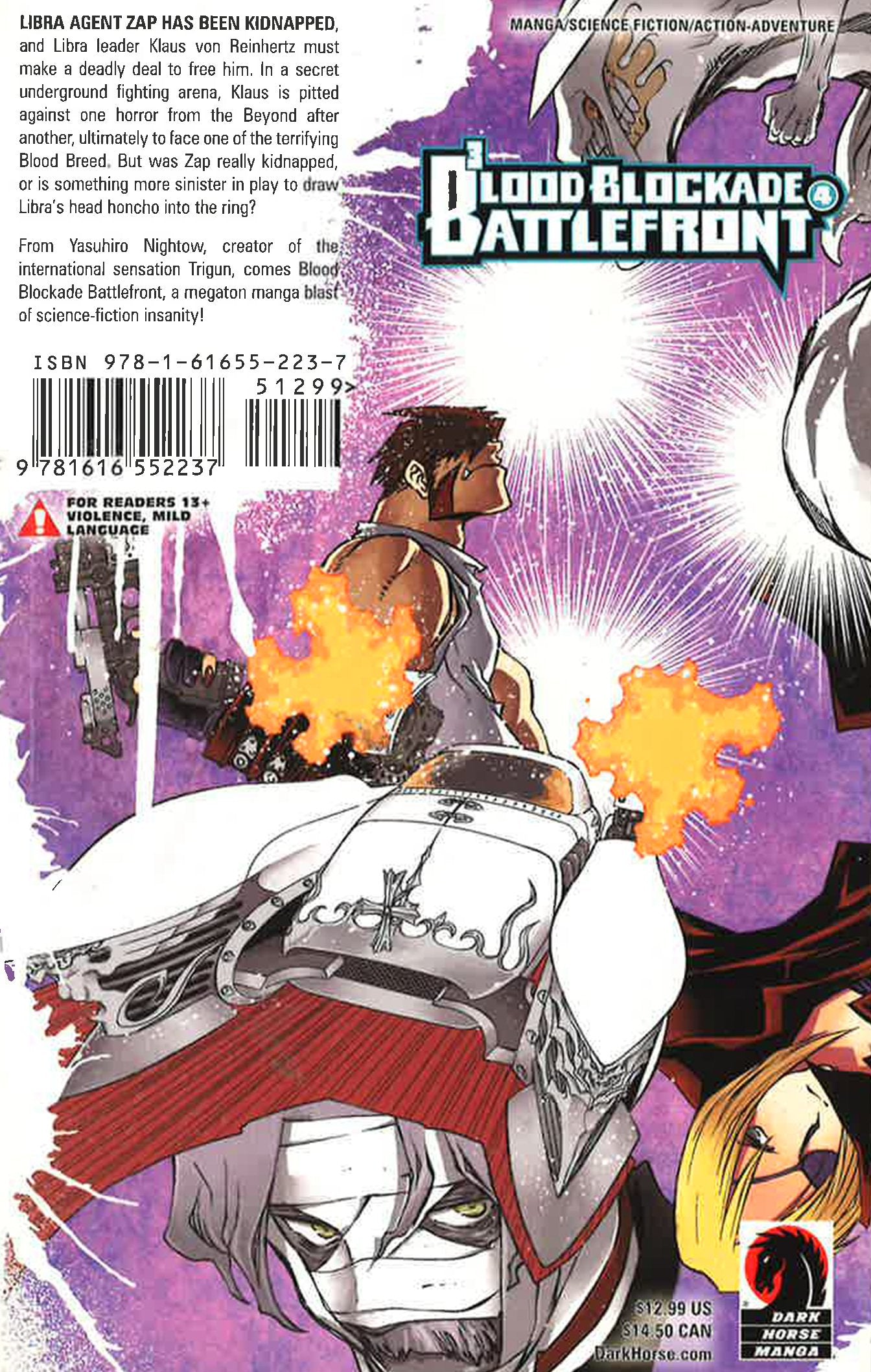 Libra agent Zap has been kidnapped, and Libra leader Klaus Von Reinhertz must make a deadly deal to free him. In a secret underground fighting arena, Klaus is pitted against one horror from the Beyond after another, ultimately to face one of the terrifying Blood Breed. But was Zap really kidnapped, or is something more sinister in play to draw Libra's head honcho into the ring? From Yasuhiro Nightow, creator of the international sensation Trigun, comes Blood Blockade Battlefront, a megaton manga blast of science-fiction insanity!