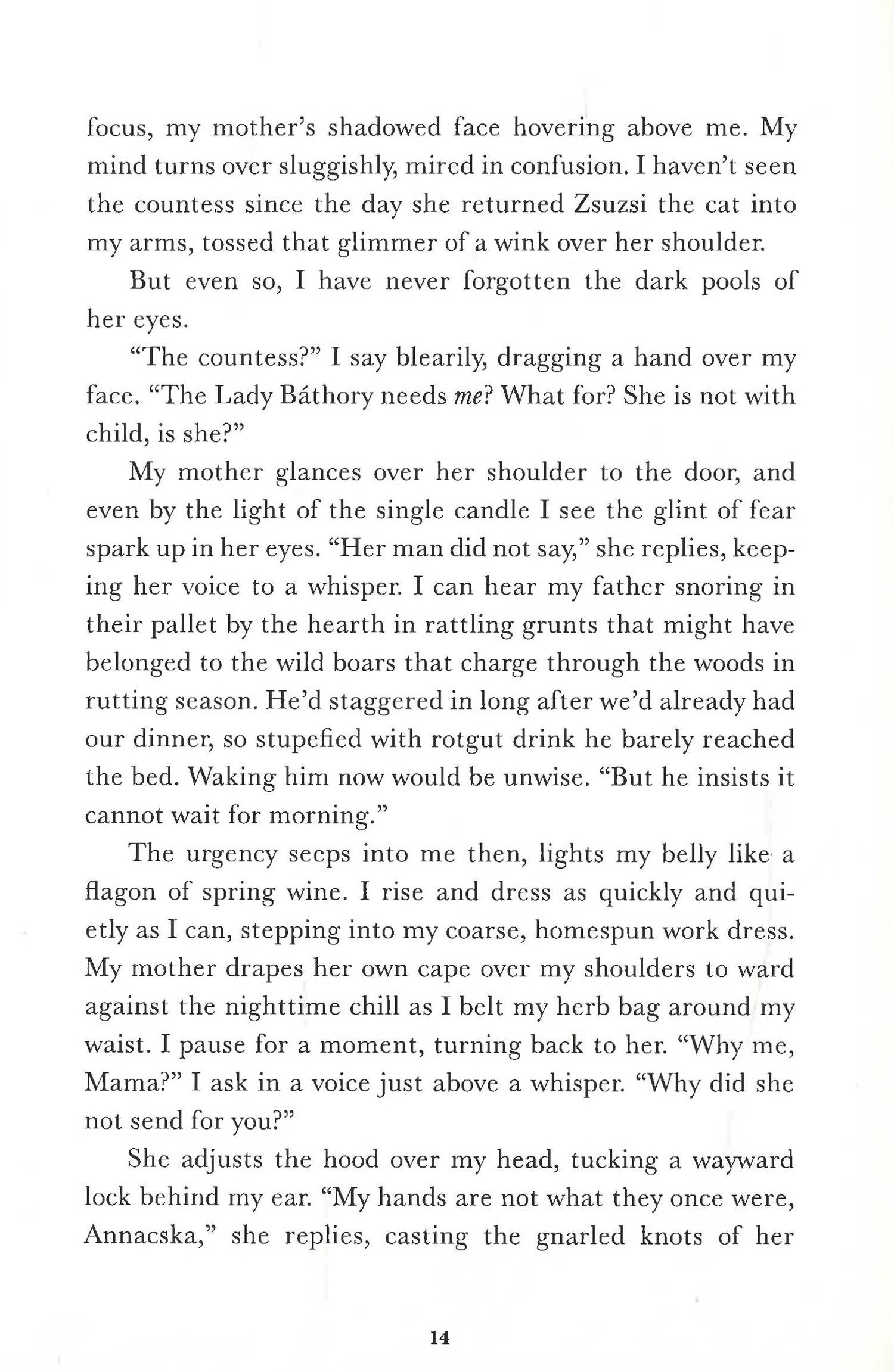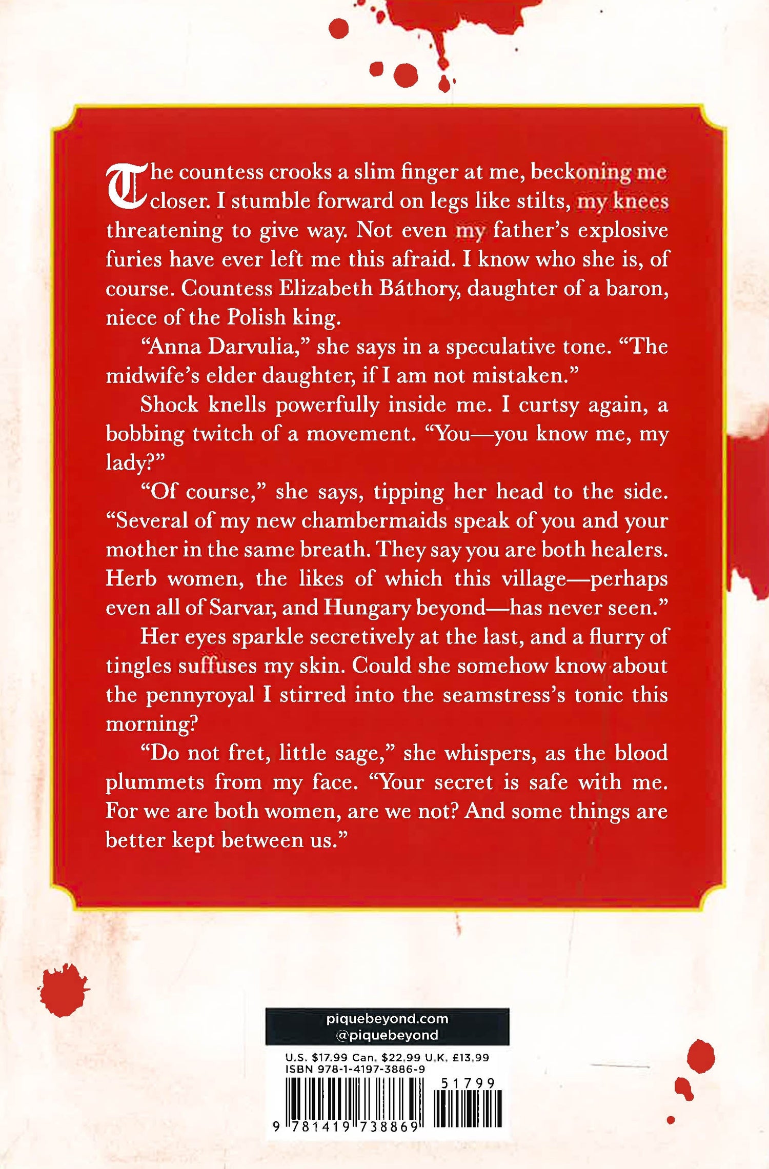 A historical YA horror novel based on the infamous real-life inspiration for Countess Dracula In 17th century Hungary, Anna Darvulia has just begun working as a scullery maid for the young and glamorous Countess Elizabeth Ba thory. When Elizabeth takes a liking to Anna, she's vaulted to the dream role of chambermaid, a far cry from the filthy servants' quarters below. She receives wages generous enough to provide for her family, and the Countess begins to groom Anna as her friend and confidante. It's not long before Anna falls completely under the Countess's spell-and the Countess takes full advantage. Isolated from her former friends, family, and fiance, Anna realizes she's not a friend but a prisoner of the increasingly cruel Elizabeth. Then come the murders, and Anna knows it's only a matter of time before the Blood Countess turns on her, too.