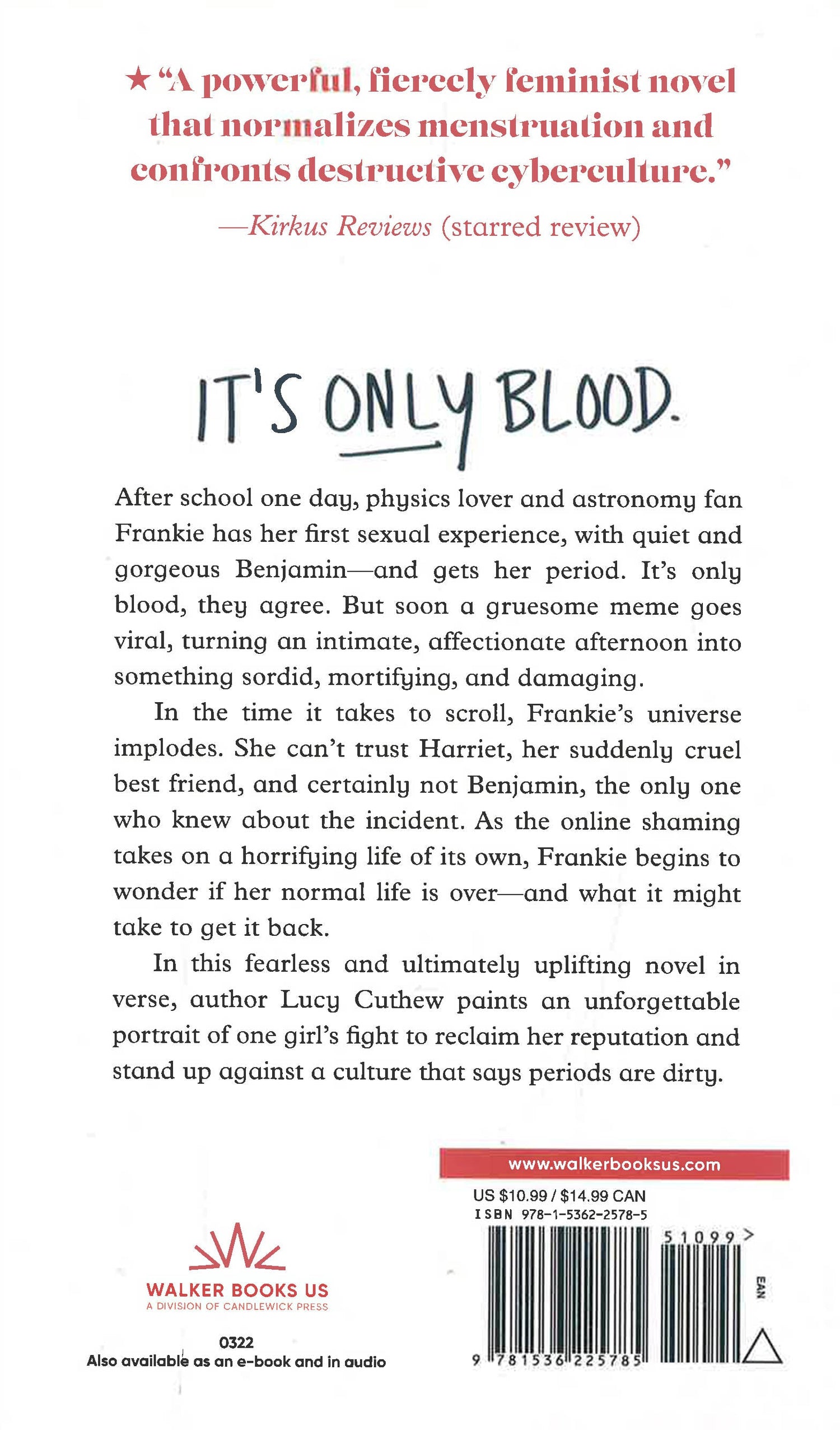 After school one day, Frankie, a lover of physics and astronomy, has her first sexual experience with quiet and gorgeous Benjamin―and gets her period. It’s only blood, they agree. But soon a gruesome meme goes viral, turning an intimate, affectionate afternoon into something sordid, mortifying, and damaging. In the time it takes to swipe a screen, Frankie’s universe implodes. Who can she trust? Not Harriet, her suddenly cruel best friend, and certainly not Benjamin, the only one who knows about the incident. As the online shaming takes on a horrifying life of its own, Frankie begins to wonder: is her real life over?