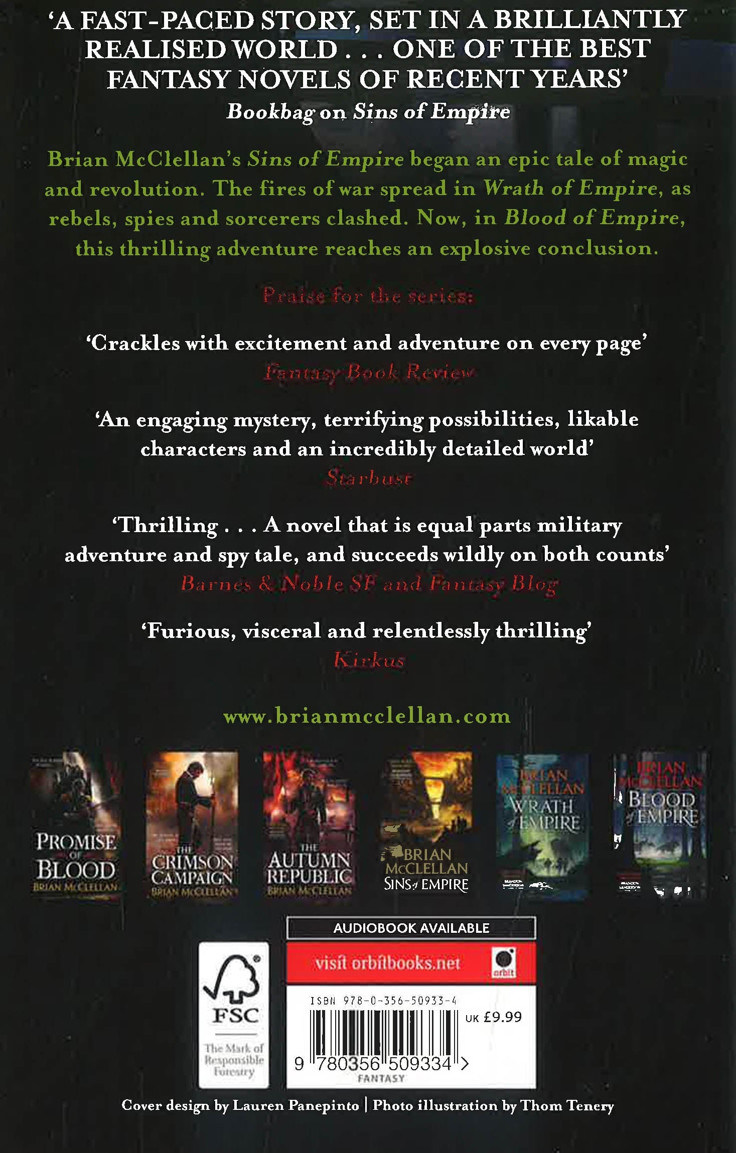 Brian McClellan's Sins of Empire began an epic tale of magic and revolution. The story continued in Wrath of Empire, as rebels, spies and sorcerers clashed. Now this thrilling adventure reaches an explosive conclusion in Blood of Empire, the final novel in the Gods of Blood and Powder series.