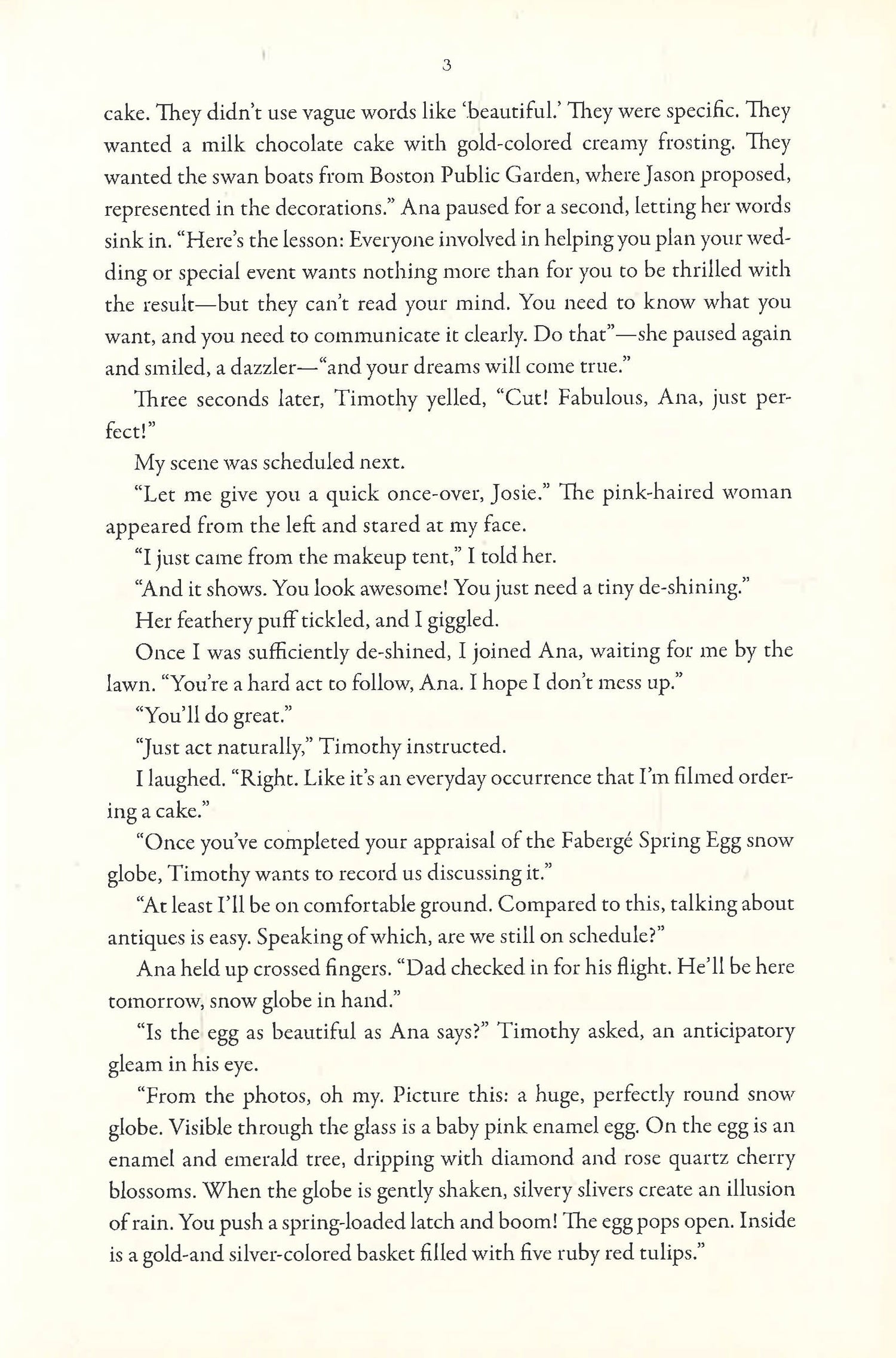 Ana Yartsin is on the verge of becoming a celebrity chef. Her custom Faberge egg-shaped cakes have brought her national attention, as has the story behind the cakes: Her family owns the spectacular Faberge Spring Egg snow globe, a magnificent example of the master craftsman's work that includes five ruby-red tulips. As she prepares to be filmed for a reality TV show about the launch of her bakery in Rocky Point, New Hampshire, Ana hires antiques expert Josie Prescott to appraise the precious egg and snow globe.
