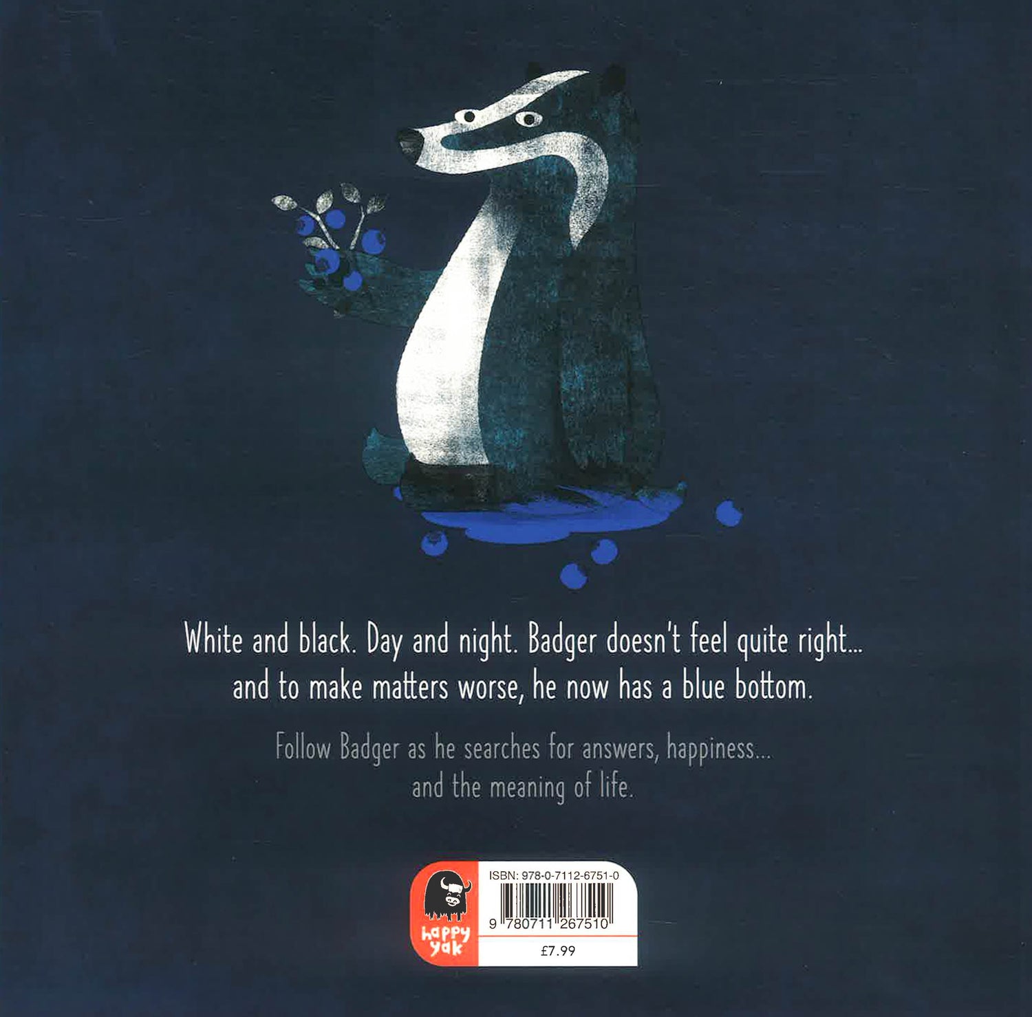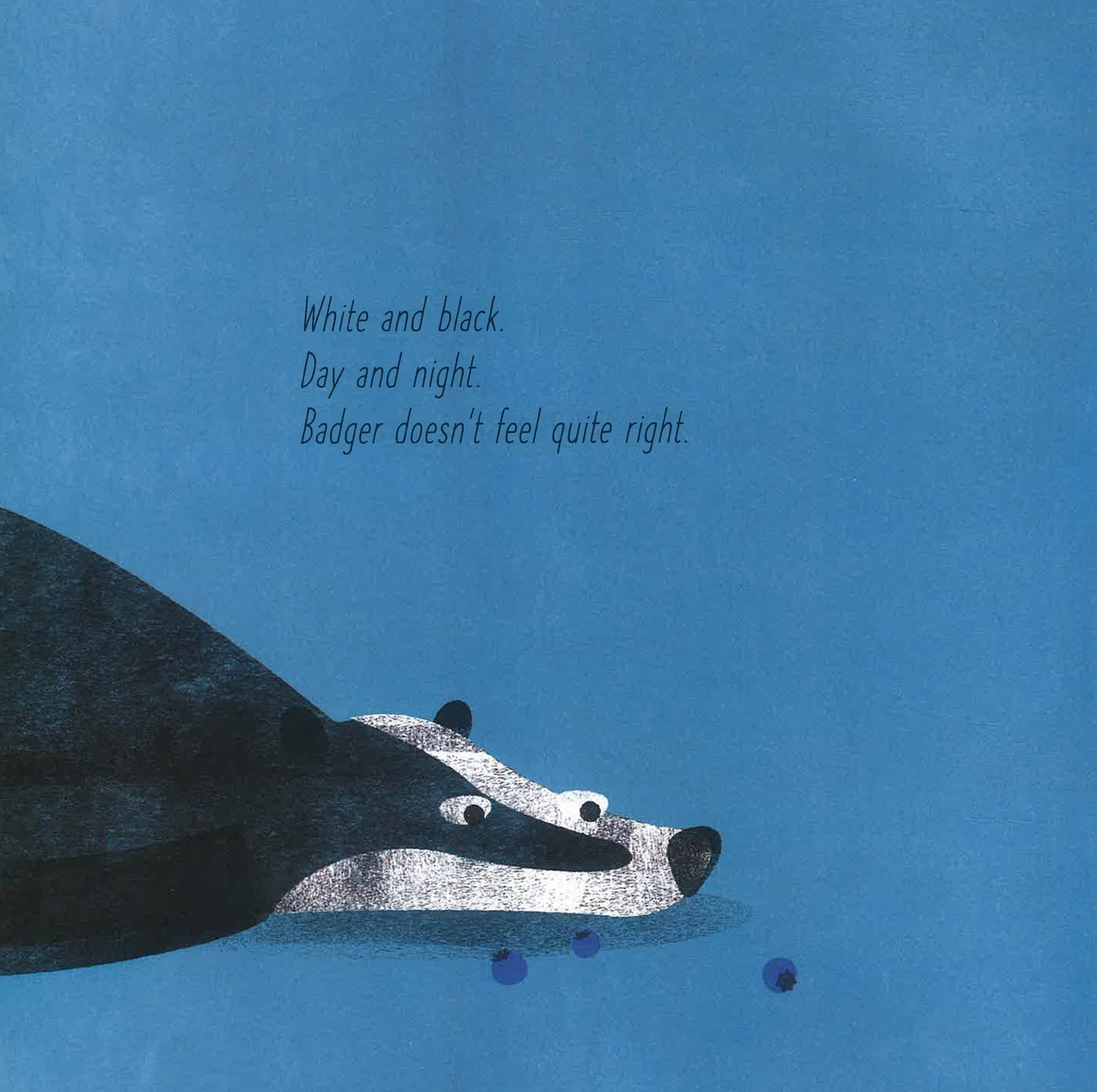 Badger is feeling sad. He can’t sleep. He asks the other animals one by one: ‘Am I white and black, or black and white?’ Can he find an answer? Is anyone listening? Does anyone care? Can he find a friend?