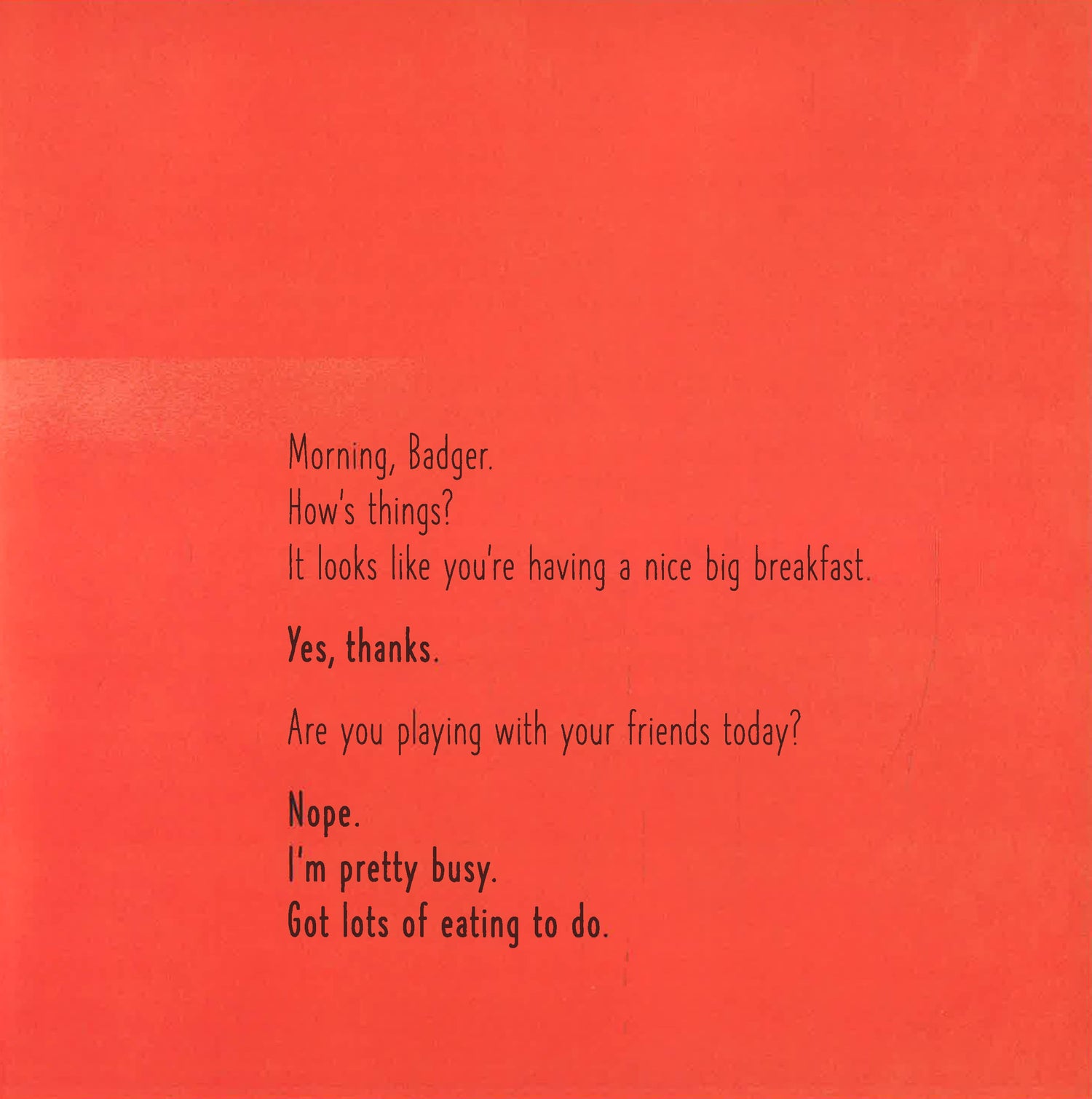 The second story in this series of witty picture books, in this story Badger is no longer feeling blue, but now his friends are sad!