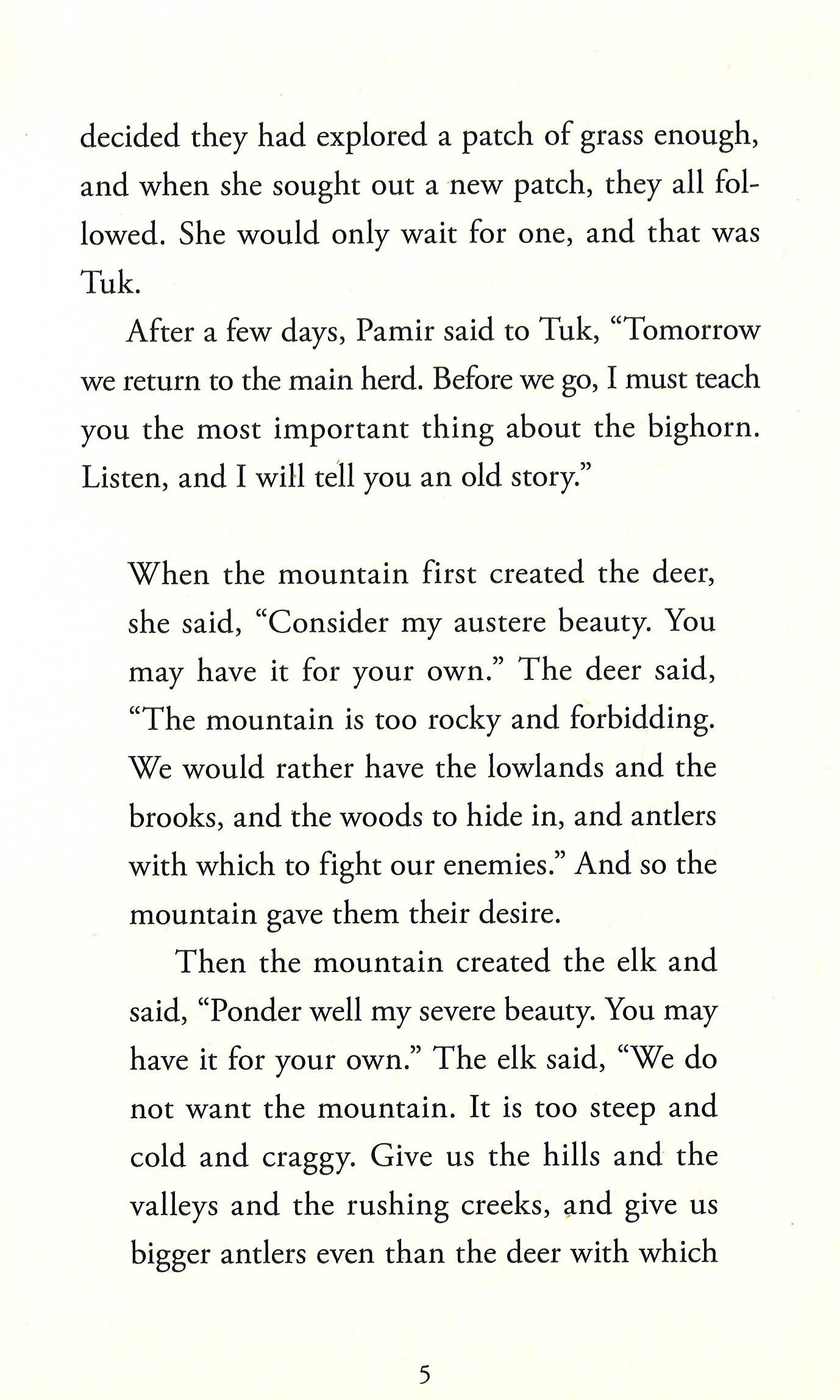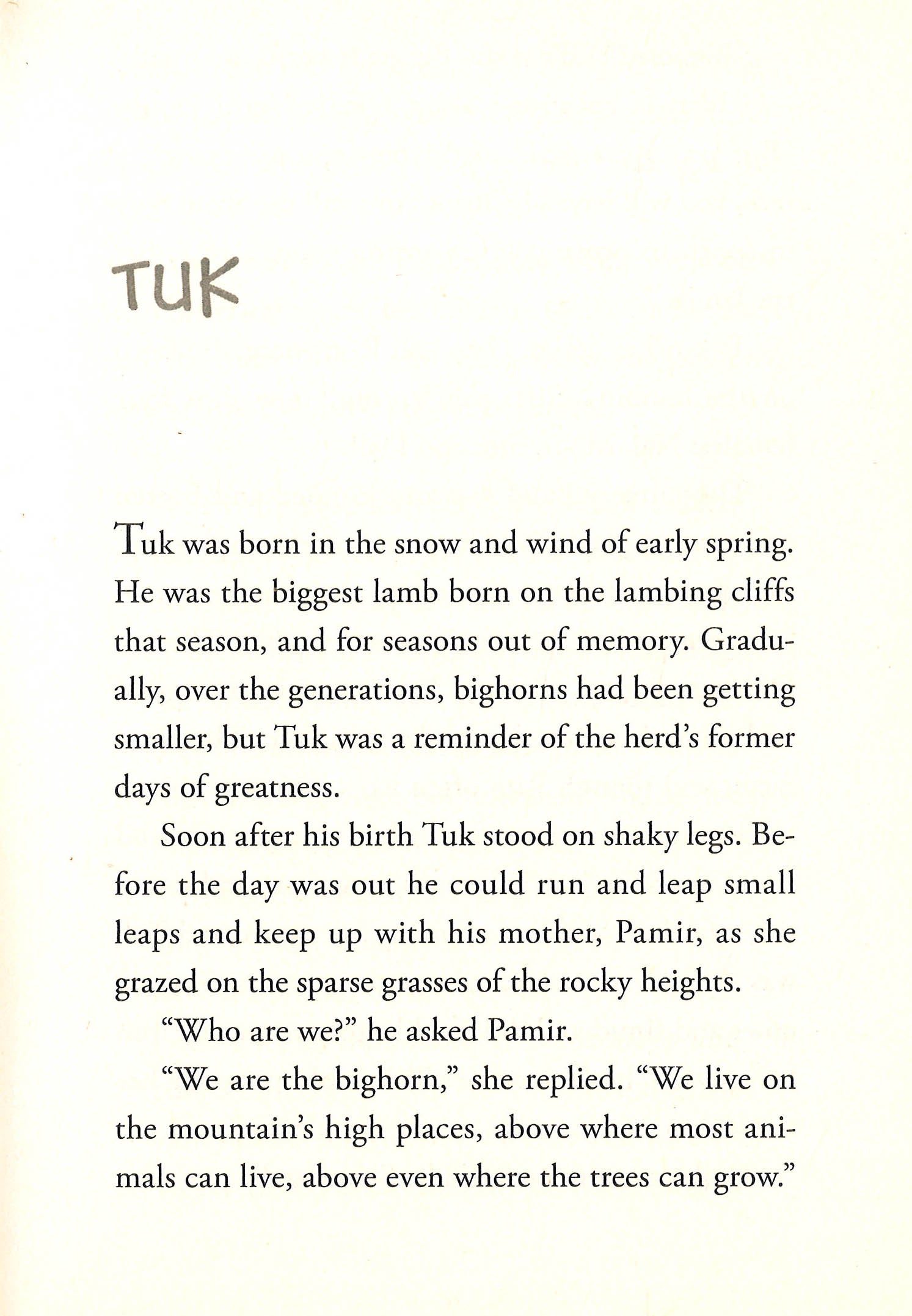 Tuk the bighorn sheep is told he will be the one to save his herd, but he is young and would rather play with his bandmates than figure out why the herd needs saving. As humans encroach further and further into their territory, there is less room for the sheep to wander, food becomes scarce, and the herd's very survival is in danger. Tuk and his friends set out to find Blue Mountain, a place that Tuk sometimes sees far in the distance and thinks might be a better home. The journey is treacherous, filled with threatening pumas and bears and dangerous lands, leading Tuk down a path that goes against every one of his instincts. Still, Tuk perseveres, reaching Blue Mountain and leading his herd into a new, safe place.