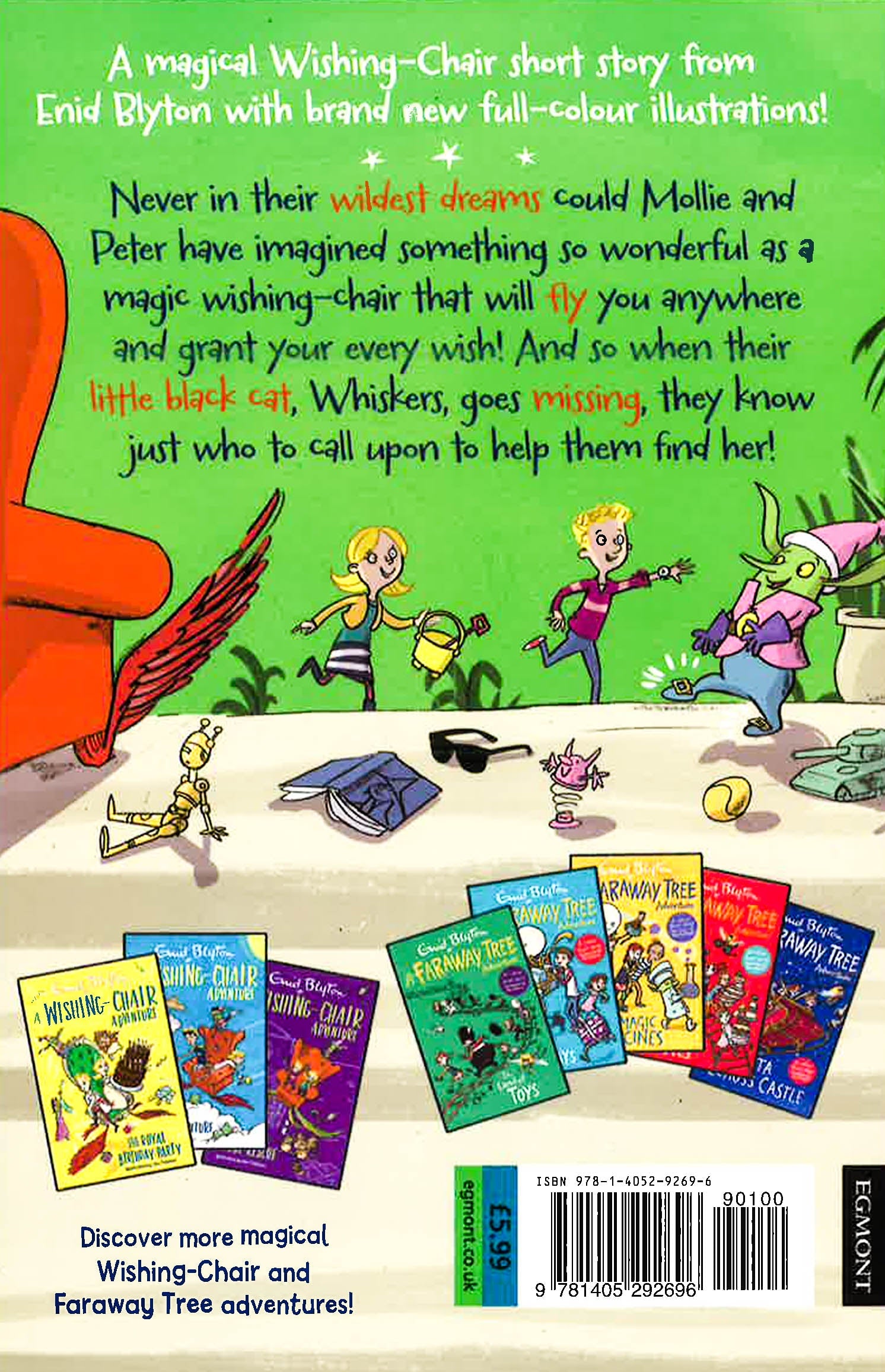 A brand new full-colour short story from Blyton's magical Wishing-Chair series - an excellent companion to the successful Magic Faraway Tree Adventure series and perfect for readers age 5+ Never in their wildest dreams, could Mollie and Peter have imagined something so wonderful as a magic Wishing-Chair that will fly you anywhere and grant your every wish! And so when their little black cat, Whiskers, goes missing, they know just who to call upon to help them find her! Short chapters and beautiful full-colour illustrations from Alex Paterson make the Wishing-Chair Adventures series perfect bedtime reading for children aged five and upwards. A richly nostalgic offering for grandparents and parents to share with the next generation of Blyton fans. 'Her books were terrific page-turners in the way no others were' - Michael Morpurgo, author of War Horse. Enid Blyton is arguably the most famous children's author of all time, thanks to series such as The Wishing-Chair, The Magic Faraway Tree, The Mysteries, Famous Five and The Secret Seven. Her fantasy books, including The Adventures of the Wishing-Chair, are among her most popular creations and they promise to enchant boys and girls for generations to come. Enid Blyton takes her place alongside Roald Dahl, Beatrix Potter, and A. A. Milne as one of Britain's true heritage children's authors. She remains one of the world's best-loved storytellers and is consistently voted a children's favourite in reader polls.