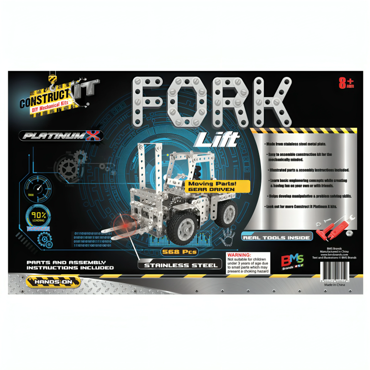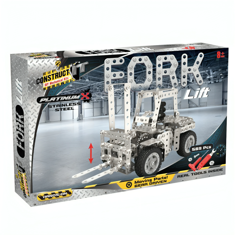 This Fork Lift from Construct IT is truly amazing! It is part of the Platinum X line so that means it uses real stainless-steel pieces. This makes construction fun, but it also makes your child feel like a real engineer or mechanic as they bring this Fork Lift to life. They get to use real-life tools which are included in the box to make the Fork Lift and each step of the construction process is broken down into easy-to-follow instructions that will help kids learn the basics of engineering as they work.