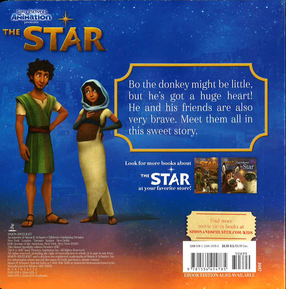Get to know Bo the donkey and all of his friends in this delightful board book inspired by The Star. Sony Pictures Animation's film The Star--featuring the amazing vocal talents of Anthony Anderson, Steven Yeun, Aidy Bryant, and many more--soars into theaters on November 10, 2017! Bo the donkey might be little, but he's got a huge heart! He and his friends are also very brave. Meet them all in this sweet story inspired by your new favorite Christmas movie! In Sony Pictures Animation's The Star, a small but brave donkey named Bo yearns for a life beyond his daily grind at the village mill. One day he finds the courage to break free, and finally goes on the adventure of his dreams. On his journey he teams up with Ruth, a loveable sheep who has lost her flock, and Dave a dove with lofty aspirations. Along with three wisecracking camels and some eccentric stable animals, Bo and his new friends follow the Star and become accidental heroes in the greatest story ever told--the first Christmas. TM & (c) 2017 Sony Pictures Animation Inc. All rights reserved