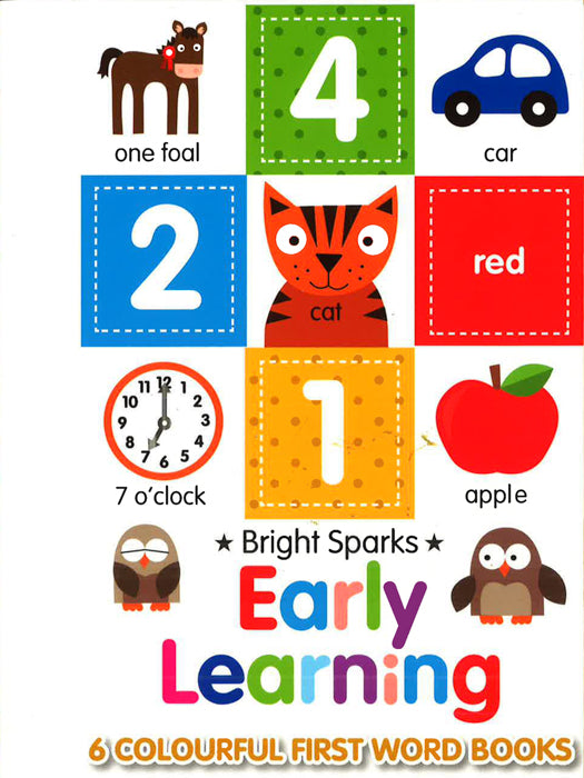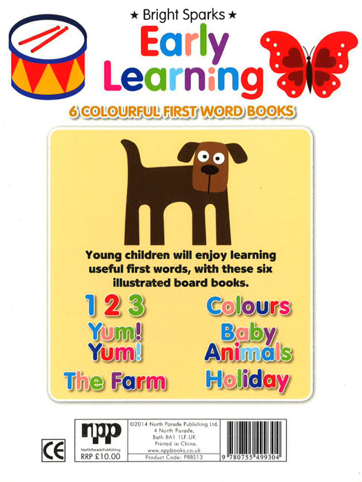 Book-shaped boxes with magnetic closures, each containing six mini board books aimed at gently introducing first words to very young children. Each book has 5 colourful spreads.