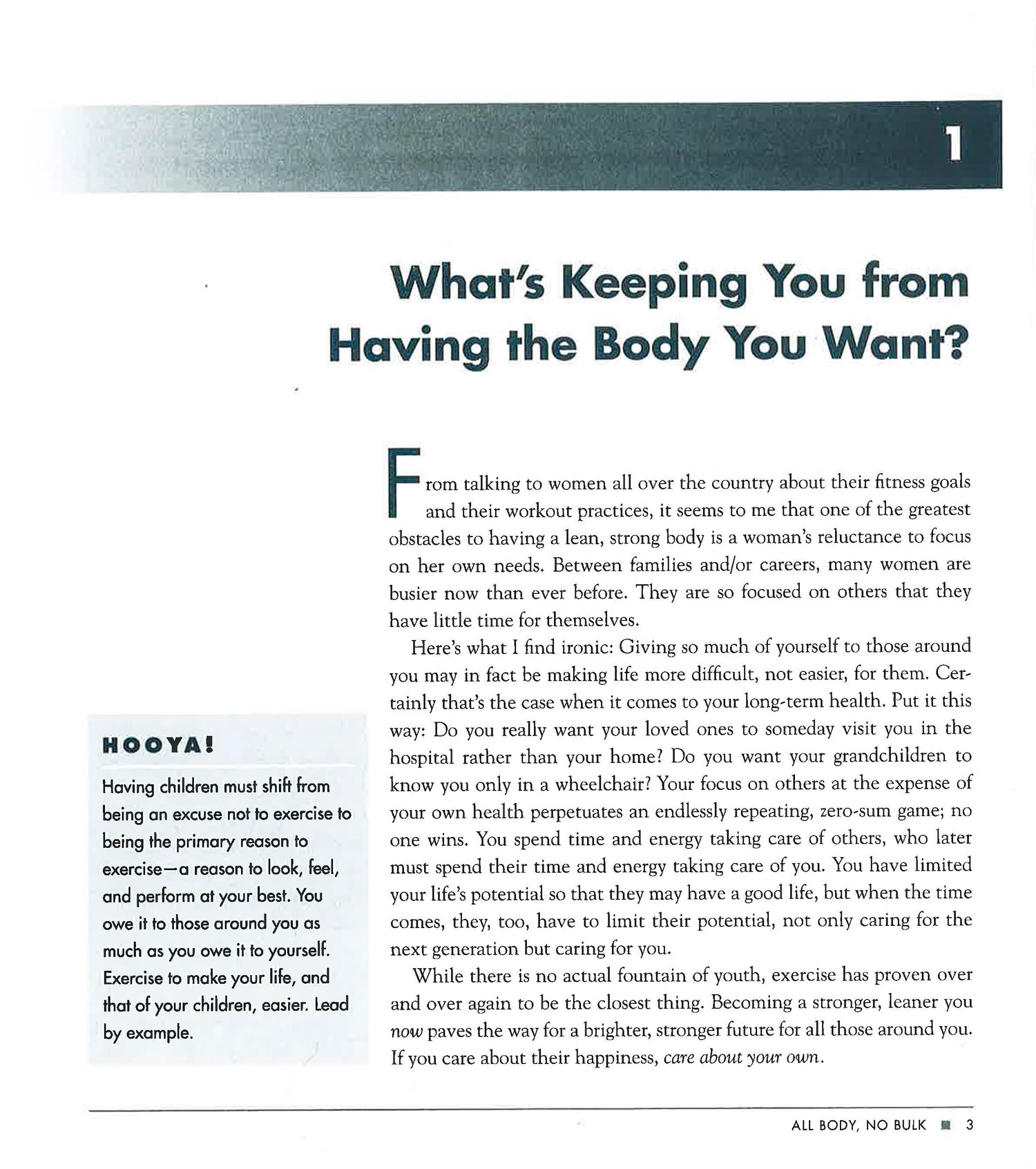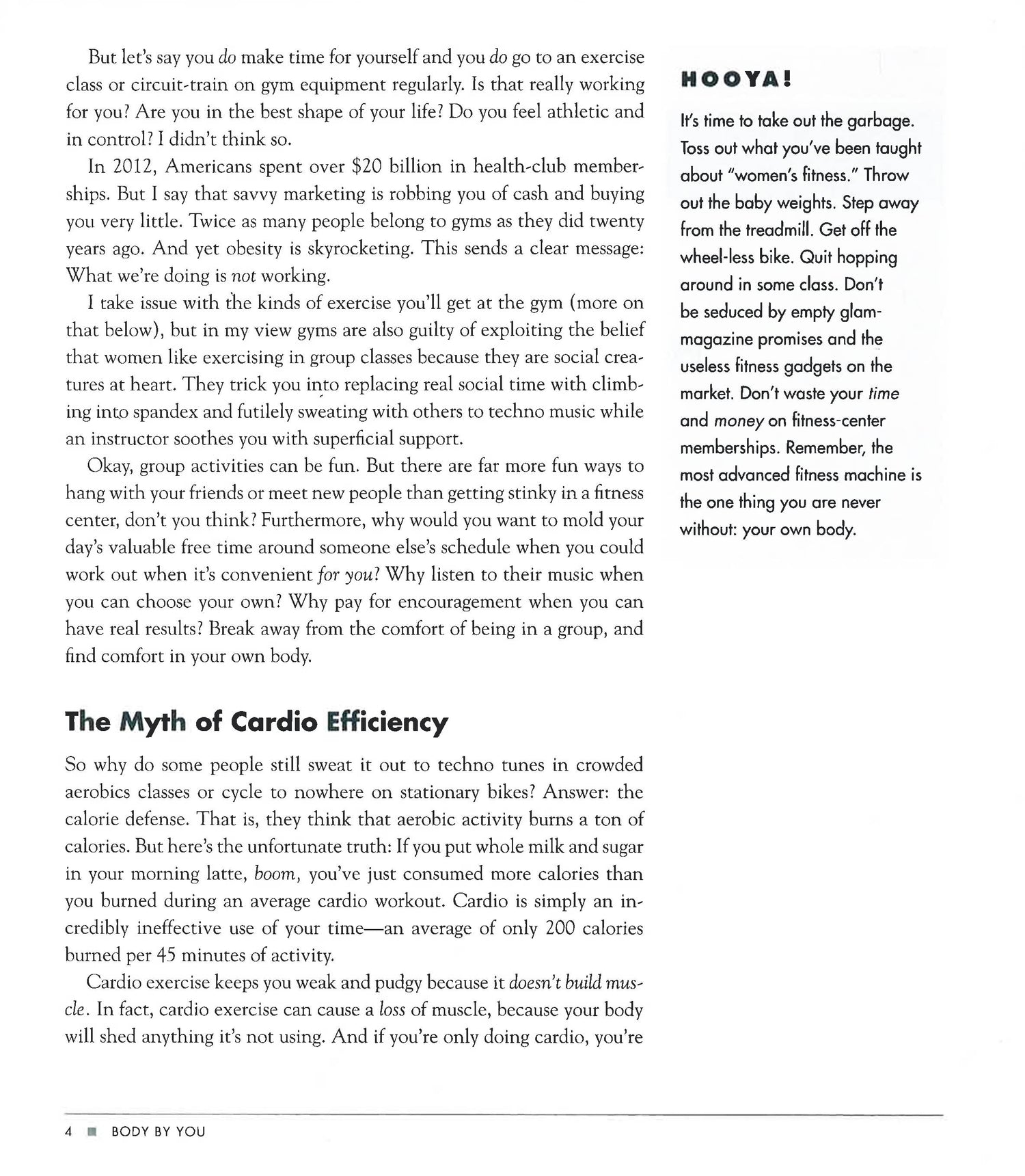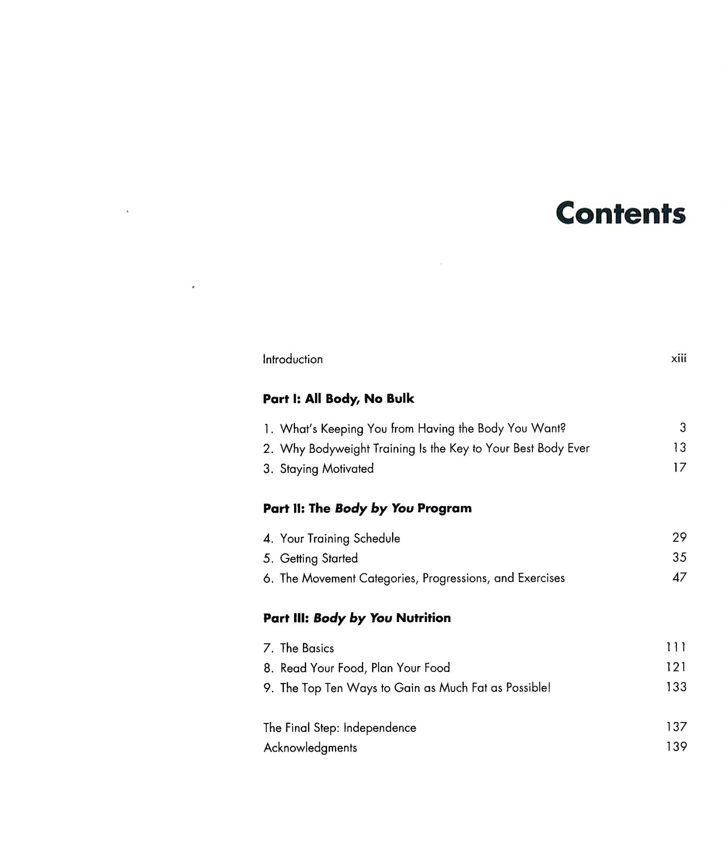 The ultimate get-in-shape-fast, at-home, no-equipment-required program designed especially for women?from the ultra-fit Special Operations trainer and author of You Are Your Own Gym Say goodbye to long, tedious hours at the gym and boring, muscle-depleting cardio exercises. Elite trainer and fitness guru Mark Lauren is here to show you that the best?and only?equipment you need to get in shape is free and always accessible: your own body. This quick and easy program will save you time, money, and maybe your life. In less than thirty minutes, three times a week?and with no machinery or weights?you can achieve the toned arms, flatter abs, tighter buns, and killer legs you?ve always wanted. You won?t build bulk, you?ll build strength, and turn your body into a fat-burning machine. Featuring 120 different exercises in five movement categories?Pulling, Squatting, In-Line Pushing, Perpendicular Pushing and Bending?and with three ascending levels of difficulty, Body by You ensures that you?ll never get bored by the same static workout. And with such a small time commitment?less than one percent of your time every week!?it is a fun program that can be effortlessly incorporated with your work and family plans. With Mark Lauren as your motivational guide and nutritional coach, Body by You will help you meet your individual fitness goals. Ultimately, it?s not about moving through the gym with ease, it?s about moving through your life with ease?leaner, stronger, more confident, and with more energy. *This book may have remainder mark and minor shelfwear*