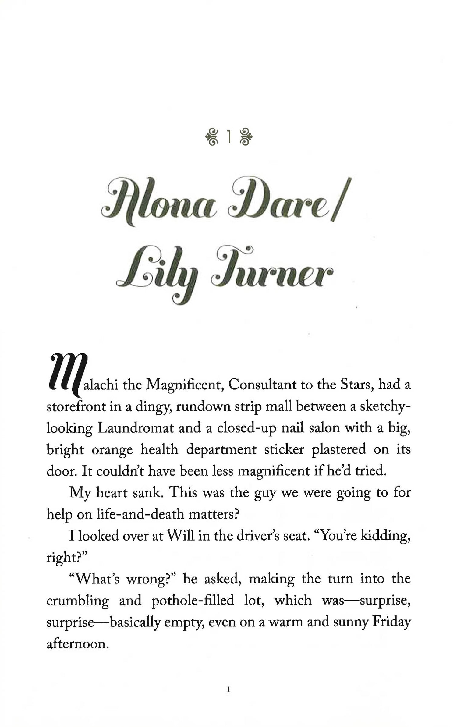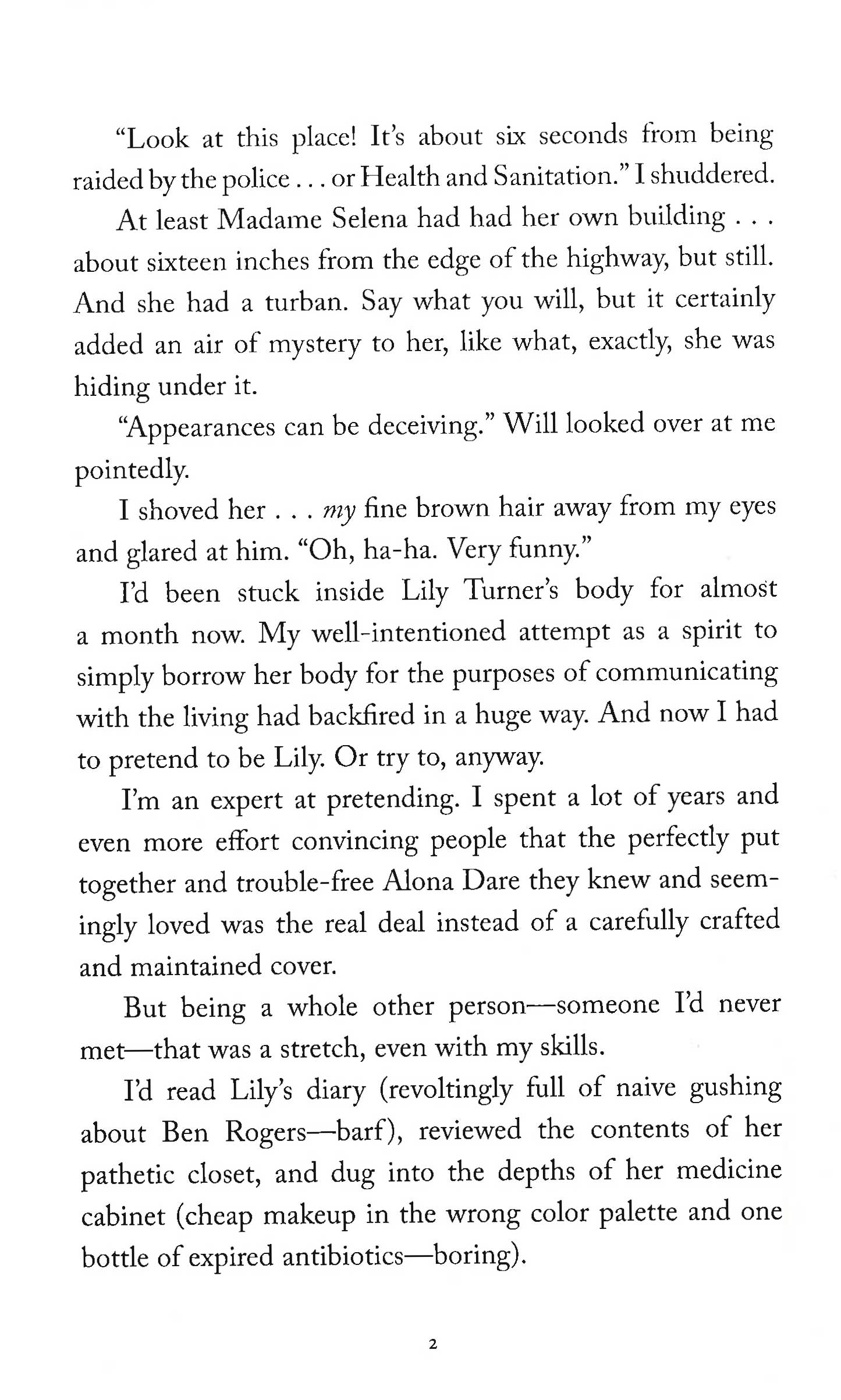 Alona Dare has been living as Lily “Ally” Turner for over a month . . . and it's not been easy. Besides being trapped in a body so not as good as her original one, she's failing miserably at playing the sister and daughter of people she barely knows. Plus, she can't help but think that Will Killian - the boy she hates to care about - somehow wishes the real Lily were back. She and Will have been trying to find a solution, looking for a two-for-one miracle that would free Alona and keep Lily alive. Visits to local psychics have proven useless, but then they stumble across Malachi the Magnificent, who seems to be different. His office is full of ghosts, for one thing. But Malachi doesn’t seem to hear or see them, which is odd. Plus, he bolts the moment he sees Will. To make things even weirder, Misty Evans, Alona's former best friend, is waiting in Malachi's lobby and claiming that she's being haunted. By Alona. Will's convinced that Malachi has answers, while Alona is all kinds of pissed that someone's impersonating her. But their efforts to uncover the truth will bring them much unwanted attention and put them directly in the path of a ghost who will stop at nothing for another stab at life. Even if it means destroying Alona.