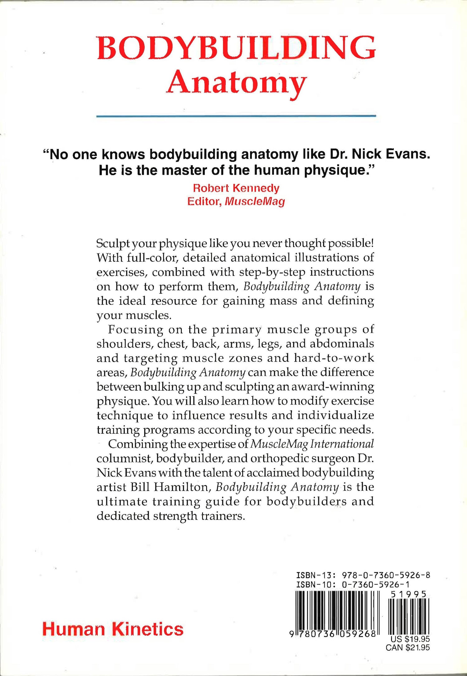 This work is aimed at bodybuilders, strength training enthusiasts and as a reference for fitness professionals. It is a new addition to the best-selling "Anatomy" series. The original text "Strength Training Anatomy", has sold over 500,000 copies worldwide and has been translated into over 20 languages. This book has enough detail for any serious strength training enthusiast, with training for specific body image goals and key emphasis on technique to avoid injury. It is a combination of top medical and anatomical knowledge with 280 illustrations to guide the reader. Organised by muscle group, each body part is subdivided into muscle target zones allowing the reader to select the specific exercises they need to emphasise hard-to-hit target spots in their physique. Each chapter includes detailed variations on modifying grip, body position, exercise trajectory and range of motion in order to emphasise different muscle groups.