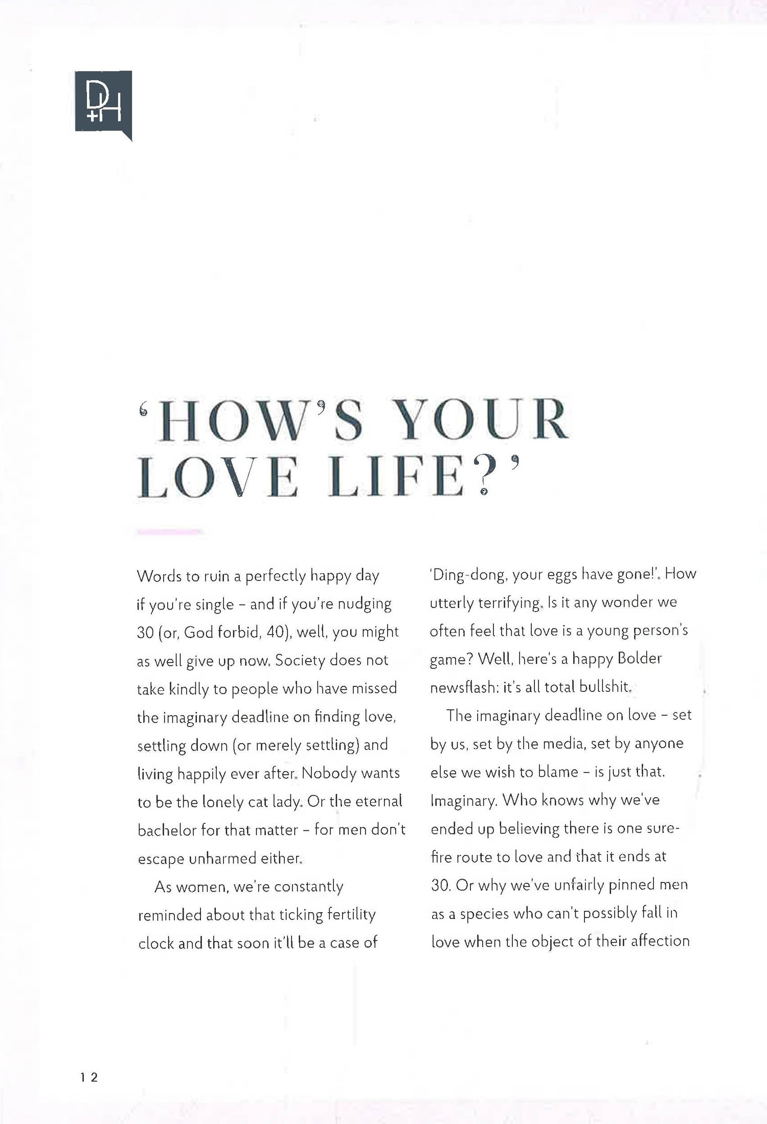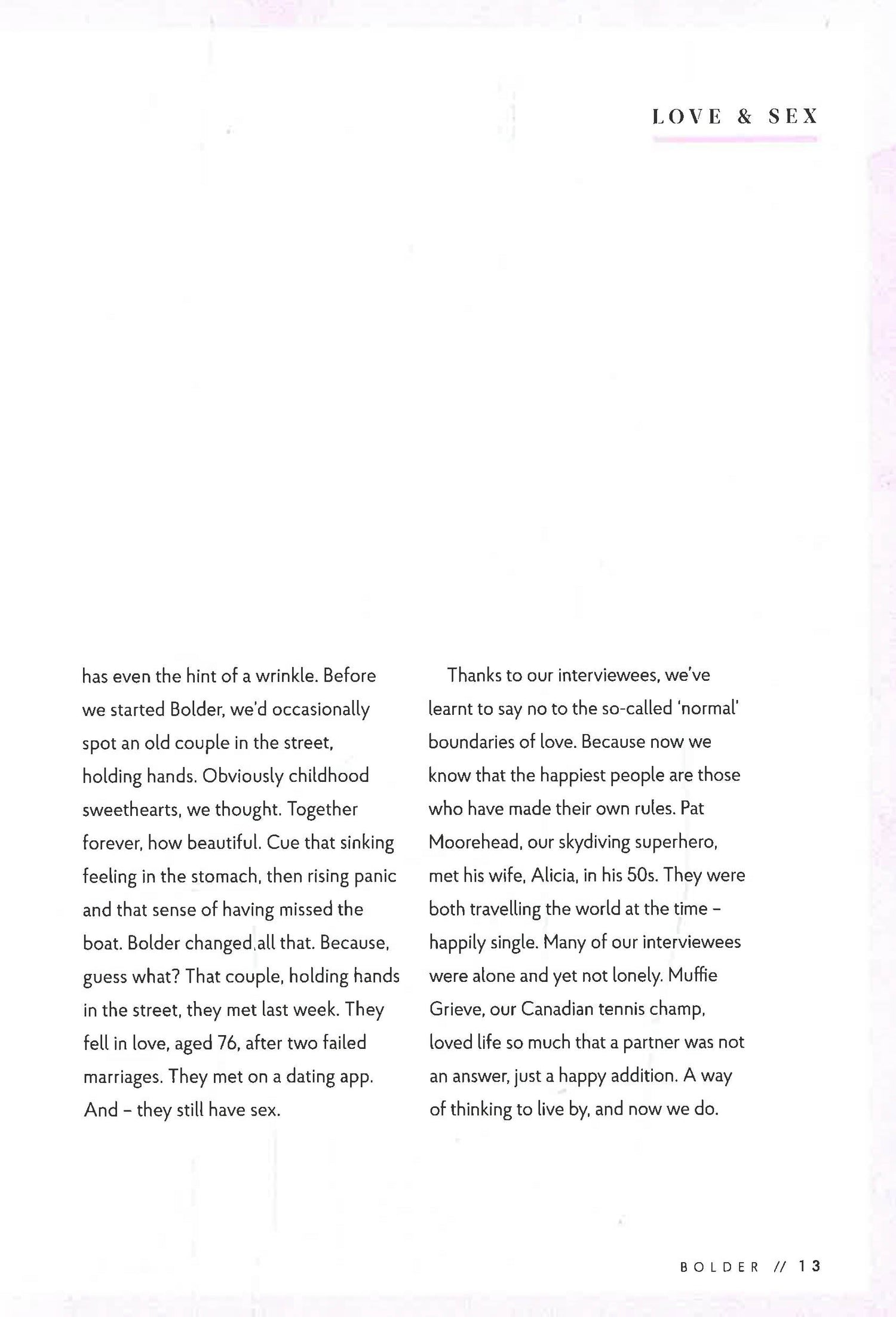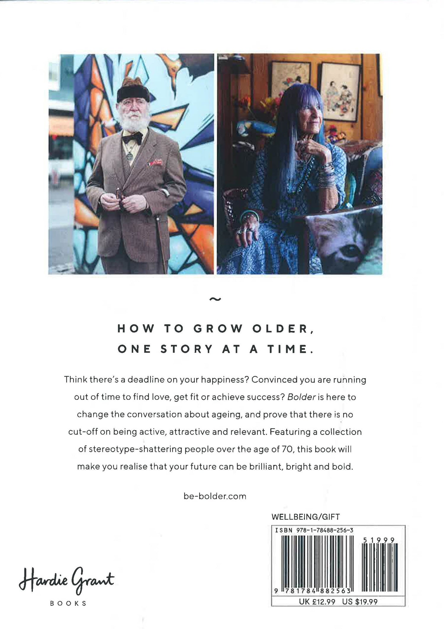 Bolder is on a mission to change perceptions about growing older. Old age tends to conjure up visions of loneliness, rocking chairs and possibly some tea and biscuits. But this book captures a journey to find people aged 70 and older who make old age look appealing or even - gasp! - fun.This book is full of real people, not acting anything like their media-prescribed age, telling their inspirational stories. One of the stories in the book features a woman who fell in love and married, aged 82. Another centres around a man who swims a mile in the Mediterranean Sea every morning, aged 85. From well-known names including Zandra Rhodes, Barbara Hulanicki and Michel Roux, to lesser-known people who will become your new heroes, you won't be able to put this book down. Nearly all of the interviewees are still working or creating in some way. And so many of them cite the happiest time of life as now, not then.Bolder champions people over the age of 70 who are still creating, inspiring or working, and the goal is to change perceptions about growing older. Chapters tackle the eternal themes of Success, Love & Sex, Happiness, Family, Health & Fitness, Style & Beauty, Work, Friends, Regrets and Death. Full of surprises and hilarity from 28 people who are anything but invisible, Bolder is full of life lessons that everyone can learn from.