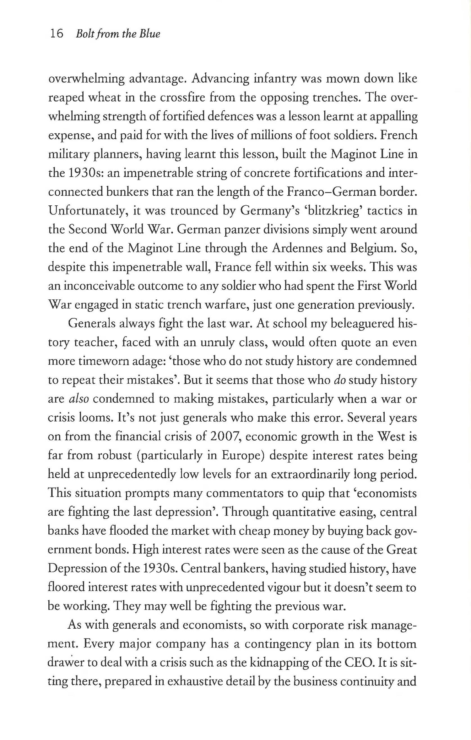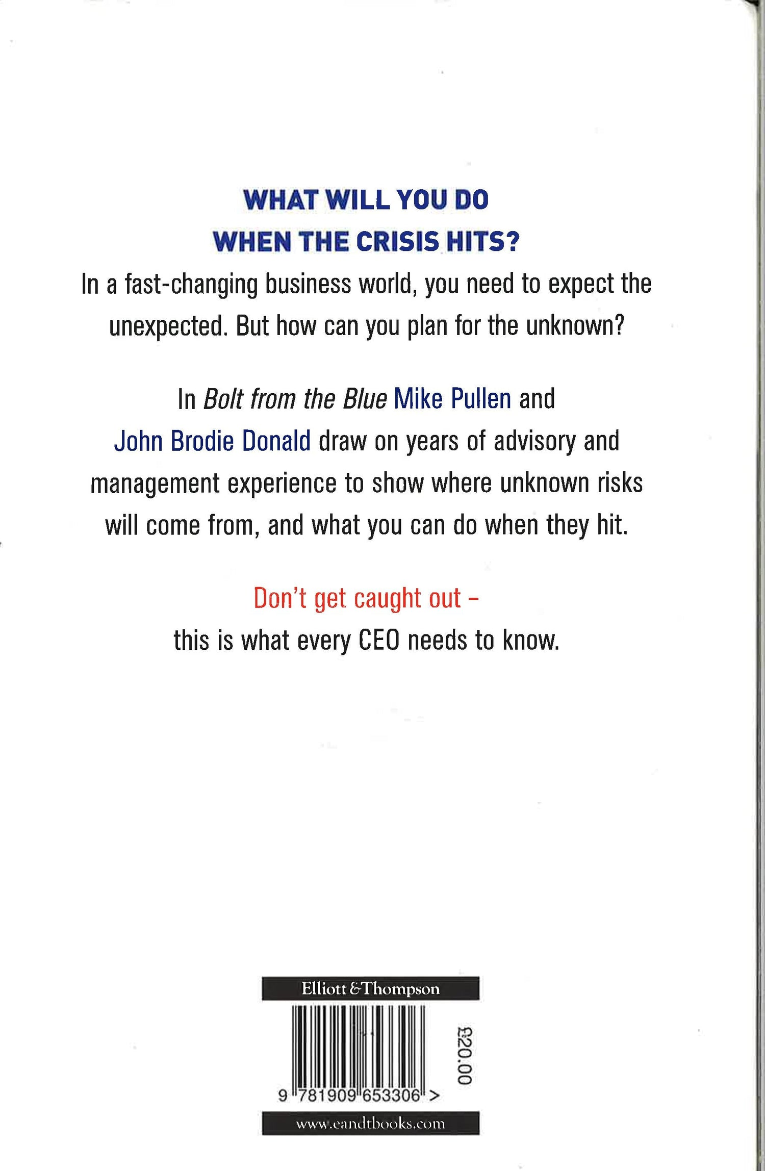 What will you do when the crisis hits? In a fast-changing business world, you need to expect the unexpected. But how can you plan for the unknown? In Bolt from the Blue Mike Pullen and John Brodie Donald draw on years of advisory and management experience to show where unknown risks will come from, and what you can do when they hit. Don't get caught out - this is what every CEO needs to know. In today's corporate world, crises can hit like a bolt from the blue. The headlines are full of stories of corporate disaster and scandal; the kneejerk reaction is often one of denial when an immediate response is needed from management. Bolt from the Blue offers essential insights for every CEO, Board of Directors and Counsel navigating through today's global business environment, with ever-increasing regulation on one side, and an ever-more vocal public on the other. Forget about the old crisis manuals, this is about the real dangers facing companies today - the ones they don't see coming.Discussing topics such as supply chain crises, regulation and legislation, non-governmental organisations, cyber threats, rogue employees and whistleblowers, Mike Pullen and John Brodie Donald examine the lessons to be learnt from the mistakes of others, and explain how to get through a crisis and come out on the other side with both reputation and company intact.