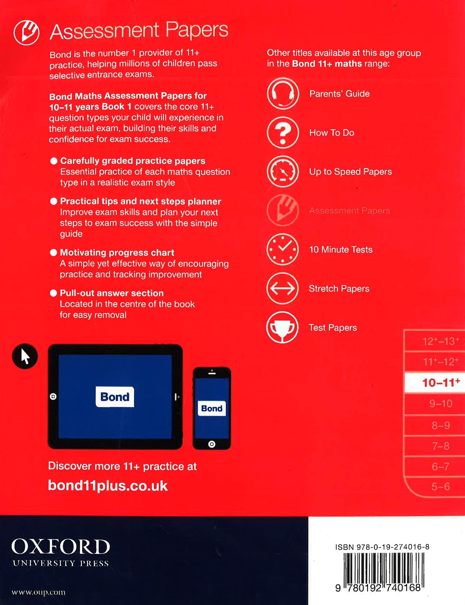 Bond is the number 1 provider of 11+ practice, helping millions of children pass selective entrance exams. Bond Maths Assessment Papers for 10-11+ years Book 1 are topic-based practice questions for the 11+ exam. They have been written to cover the core 11+ question types your child will experience in their actual exam, building the skills and confidence for exam success.
