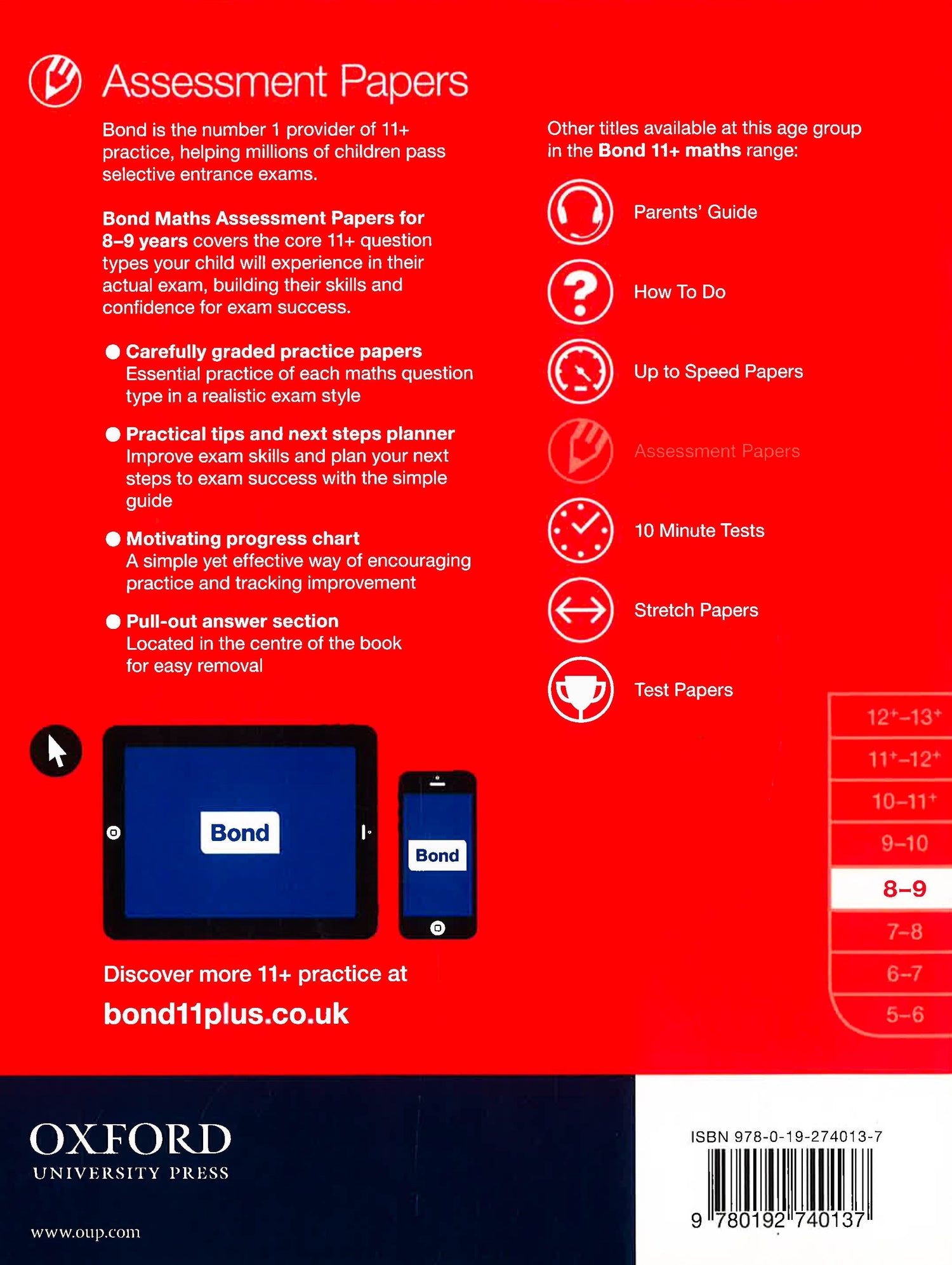 Bond is the number 1 provider of 11+ practice, helping millions of children pass selective entrance exams. Bond Maths Assessment Papers for 8-9 years are topic-based practice questions for the 11+ exam. They have been written to cover the core 11+ question types your child will experience in their actual exam, building the skills and confidence for exam success.