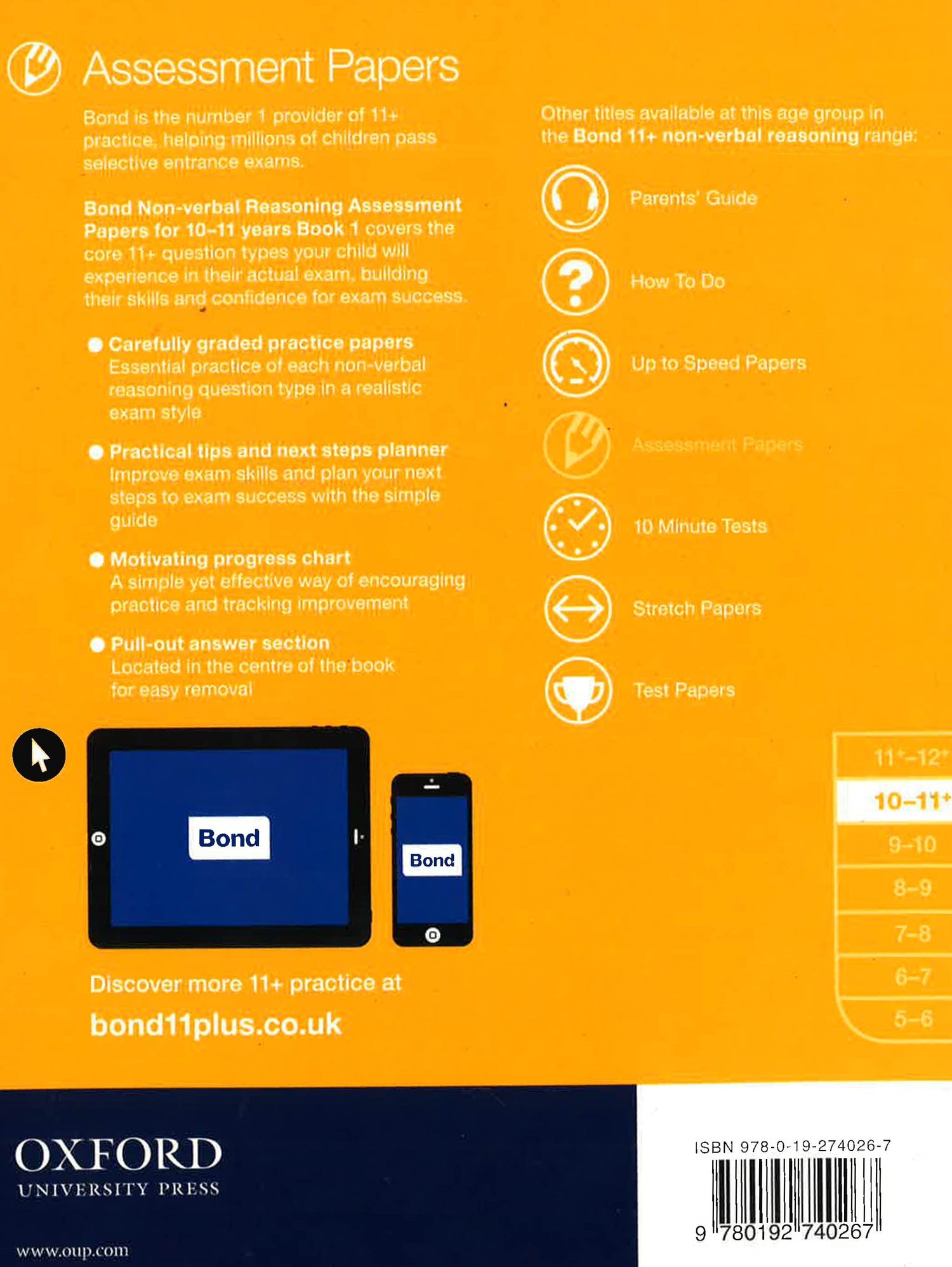 Bond is the number 1 provider of 11+ practice, helping millions of children pass selective entrance exams. Bond Non-verbal Reasoning Assessment Papers for 10-11+ years Book 1 develops non-verbal reasoning problem-solving skills, encouraging thinking skills and providing preparation for Common Entrance and 11+ exams.