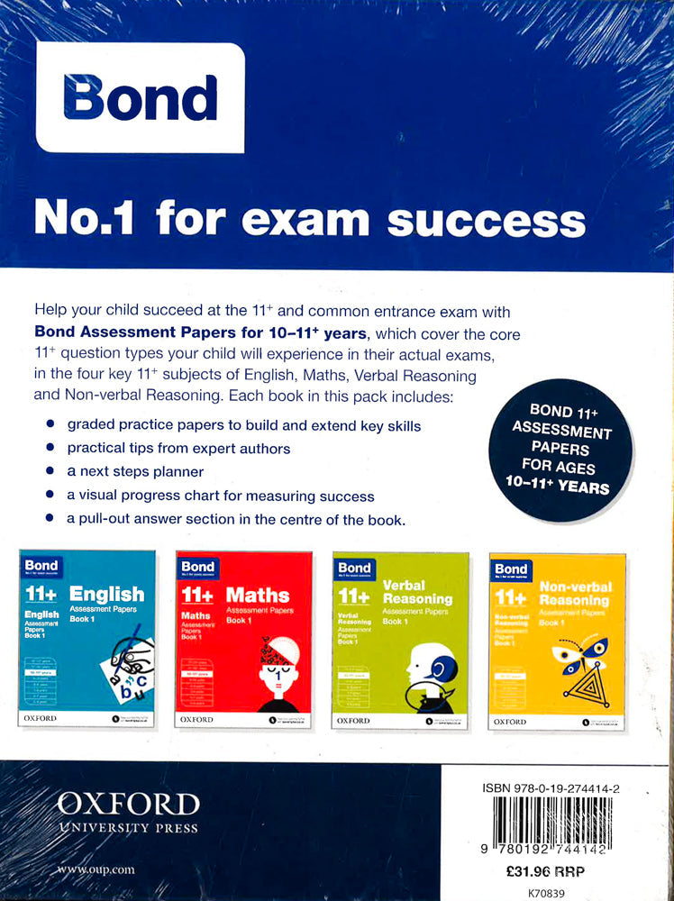 The Bond 11+ Assessment Papers Book Set is suited to students aged 10-11 years studying in key stage 3 at secondary school level. Published by Oxford University Press, the set contains four books of assessment papers covering the areas of English, Mathematics, Verbal Reasoning, and Non-Verbal Reasoning.