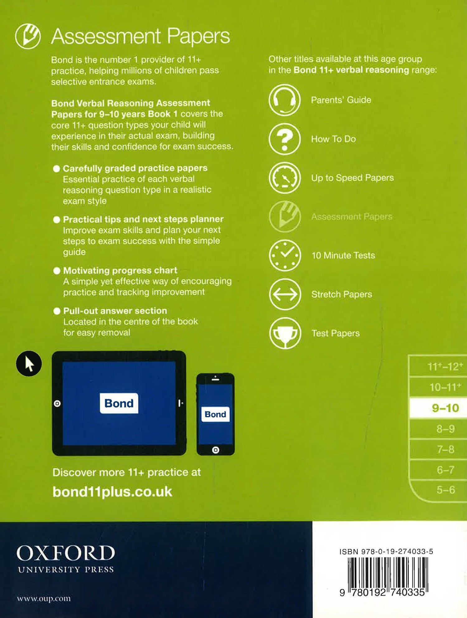 Bond is the number 1 provider of 11+ practice, helping millions of children pass selective entrance exams. Bond Verbal Reasoning Assessment Papers for 9-10 years Book 1 develops verbal reasoning problem-solving skills, encouraging thinking skills and providing preparation for Common Entrance and 11+ exams.