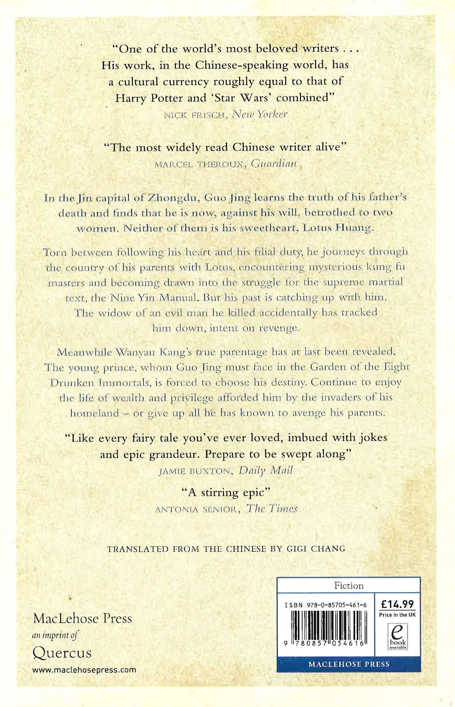 In the Jin capital of Zhongdu, Guo Jing learns the truth of his father's death and finds he is now betrothed, against his will, to two women. Neither of them is his sweetheart Lotus Huang. Torn between following his heart and fulfilling his filial duty, he journeys through the country of his parents with Lotus, encountering mysterious martial heroes and becoming drawn into the struggle for the supreme martial text, the Nine Yin Manual. But his past is catching up with him. The widow of an evil man he accidentally killed as a child has tracked him down, intent on revenge. Meanwhile, his true parentage at last revealed, Yang Kang, the young prince Guo Jing must face in the Garden of the Eight Drunken Immortals, is forced to choose his destiny. Will he continue to enjoy the life of wealth and privilege afforded to him by the invader of his homeland, or give up all he has known to avenge his parents? Translated from the Chinese by Gigi Chang
