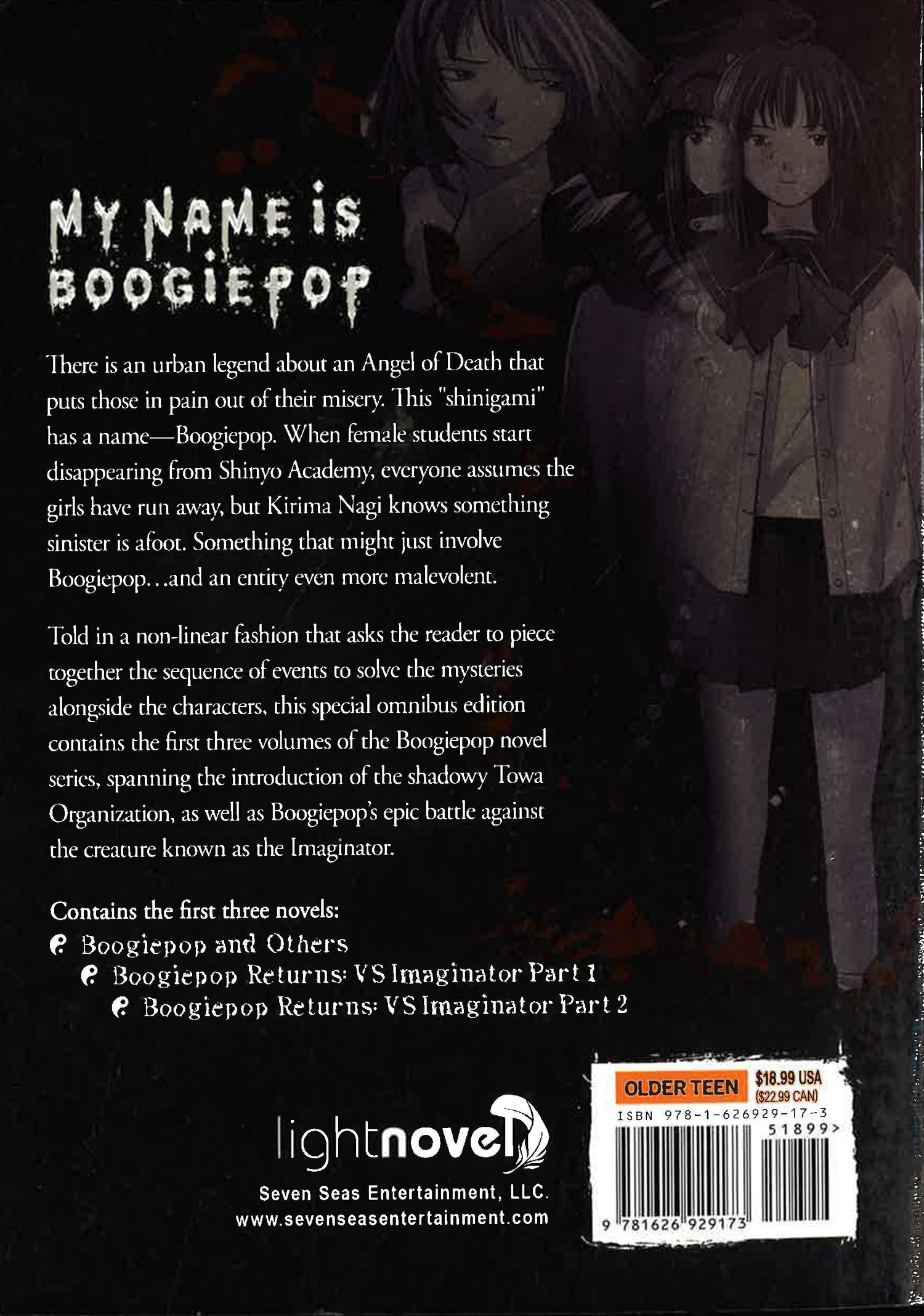 Told in a non-linear fashion that asks the reader to piece together the sequence of events to solve the mysteries alongside the characters, Kouhei Kadono's first Boogiepop novel took First Place in Media Works' Dengeki Game Novel Contest in 1997 and ignited the Japanese "light novel" trend. Today, there are over 2 million Boogiepop novels in print, a feature film and manga adaptation based on the first book, an original manga entitled Boogiepop Dual, and the unforgettable original anime series Boogiepop Phantom.