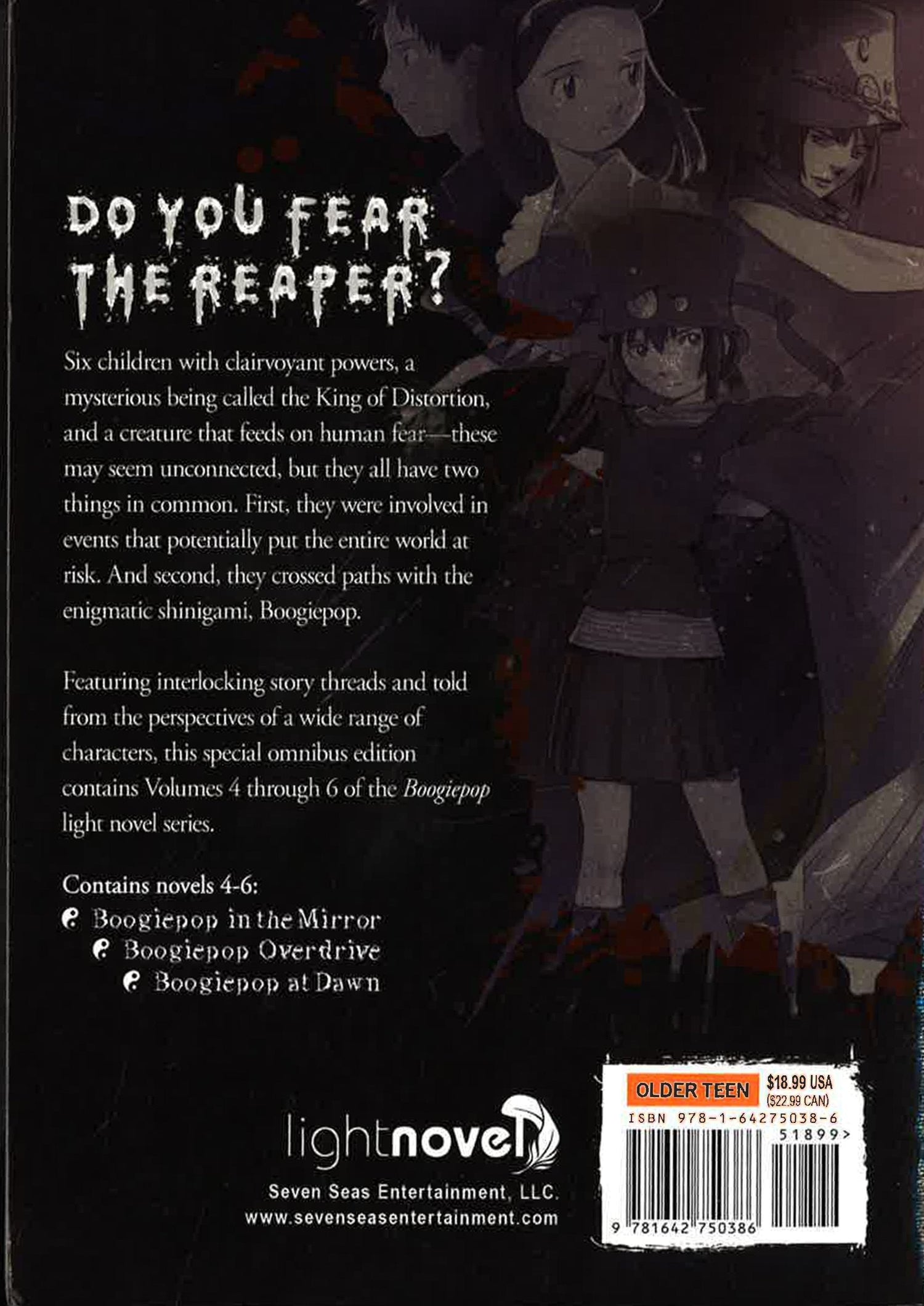 There is an urban legend that children tell one another about a shinigami that can release people from the pain they may be suffering. This "Angel of Death" has a name: Boogiepop. And the legends are true. Boogiepop is real. Told in a non-linear fashion that asks the reader to piece together the sequence of events to solve the mysteries alongside the characters, Kouhei Kadono's first Boogiepop novel took First Place in Media Works' Dengeki Game Novel Contest in 1997 and ignited the Japanese "light novel" trend. Today, there are over 2 million Boogiepop novels in print, a feature film and manga adaptation based on the first book, an original manga entitled Boogiepop Dual, and the unforgettable original anime series Boogiepop Phantom.