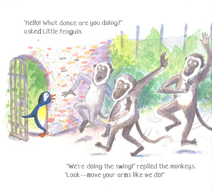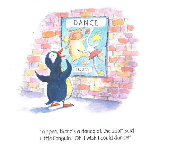 After reading that there will be a dance at the zoo, Little Penguin tries to learn some steps from the other animals but neither Monkey's samba, Flamingo's ballet, nor the hippos' line dance seems quite right for him.