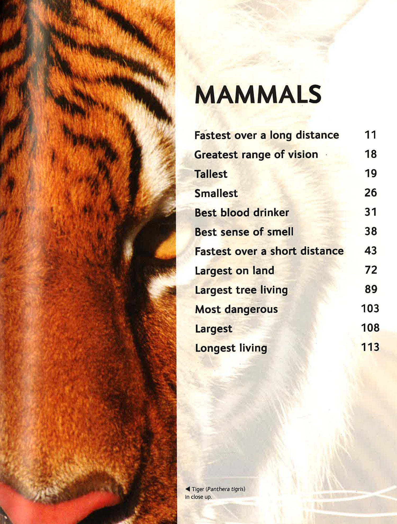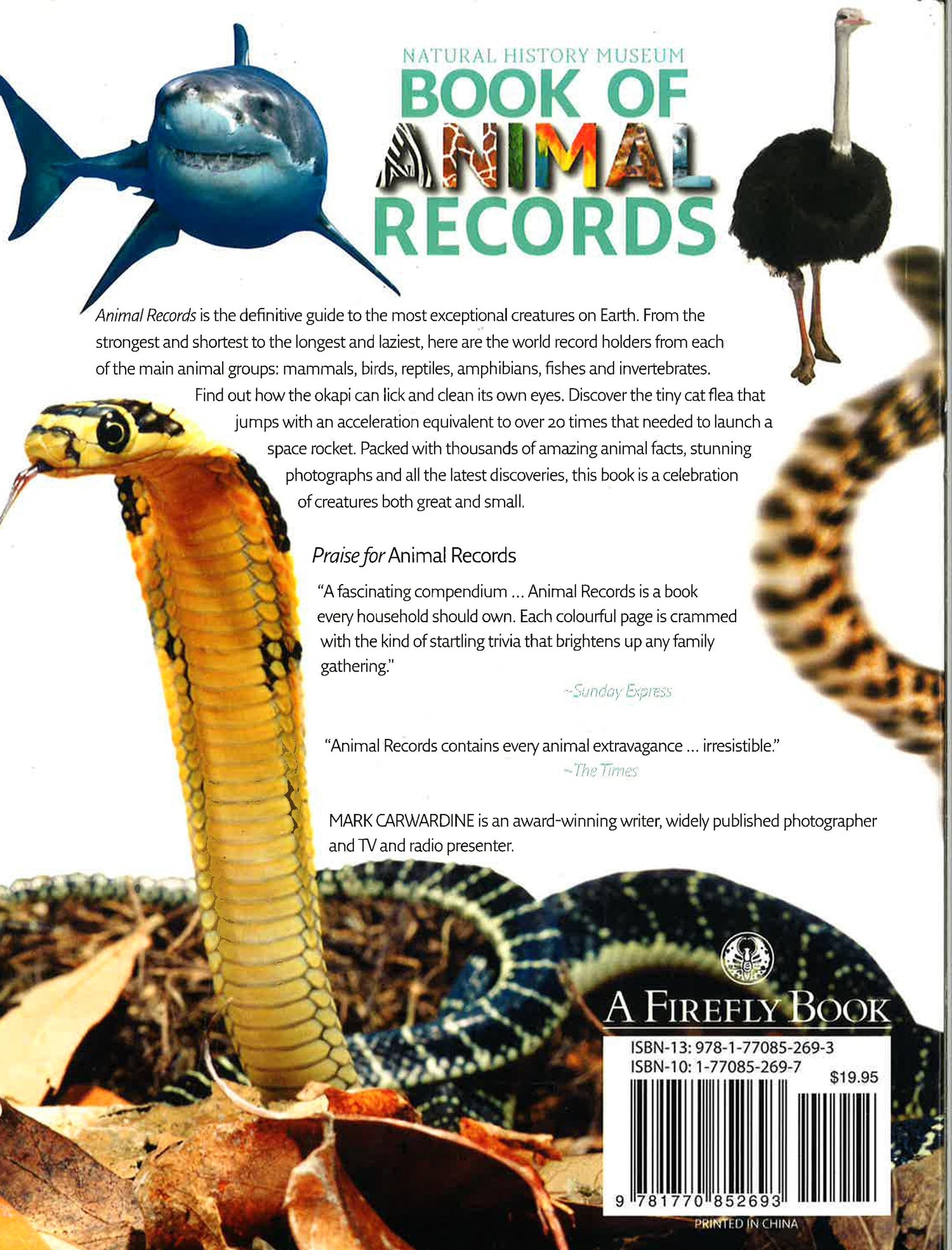 Here are the achievers and the unique from the animal world: mammals, birds, reptiles, amphibians, fishes and invertebrates. These are not only familiar records like highest, fastest, largest, these are the unusual, such as slowest growth (the deep sea clam), most pecks in a day (black woodpecker), noisiest bird (booming Kakapo) and worst climber (western fence lizards fall out of their oak tree homes about 12,000 times a year). There are myth-busters -- centipedes have the most legs, not millipedes, and fascinating stories -- two "dead" specimens of desert snail were glued onto a museum display tablet only to come out of hibernation four years later. There is a lot of the bizarre (horned lizards from western North America can squirt blood from their eyes) and the ingenious (humpback whales use bubbles as fishing nets). The mammals, amphibians, reptiles and invertebrates are organized by animal order, family and species. Birds are organized by category. Many animals are described for more than one record e.g., camels and llamas are described for the altitude at which they live and for which is the largest and the smallest. Exceptionality is within each category rather than the entire Animal Kingdom, for example, the largest bat is the flying fox bat but the largest of all land mammals is the elephant and the largest of all animals is the blue whale. Natural History Museum Book of Animal Records includes almost 900 records that show the diversity and wonder of the animal kingdom: Mammals: 381 records Birds: 133 records Reptiles: 101 records Amphibians: 33 records Fish: 38 records Invertebrates: 191 records. Science is revealing unknown animal behaviors and finding new species. Behavioral research is adding a new dimension to our knowledge of what animals do, where, why and how. Natural History Museum Book of Animal Records is a fascinating sampling of these amazing discoveries.