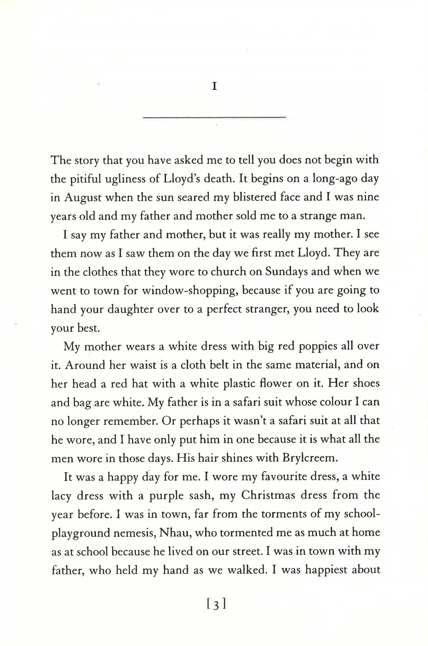 The story that you have asked me to tell you does not begin with the pitiful ugliness of Lloyd's death. It begins on a long-ago day in August when the sun seared my blistered face and I was nine years old and my father and mother sold me to a strange man.