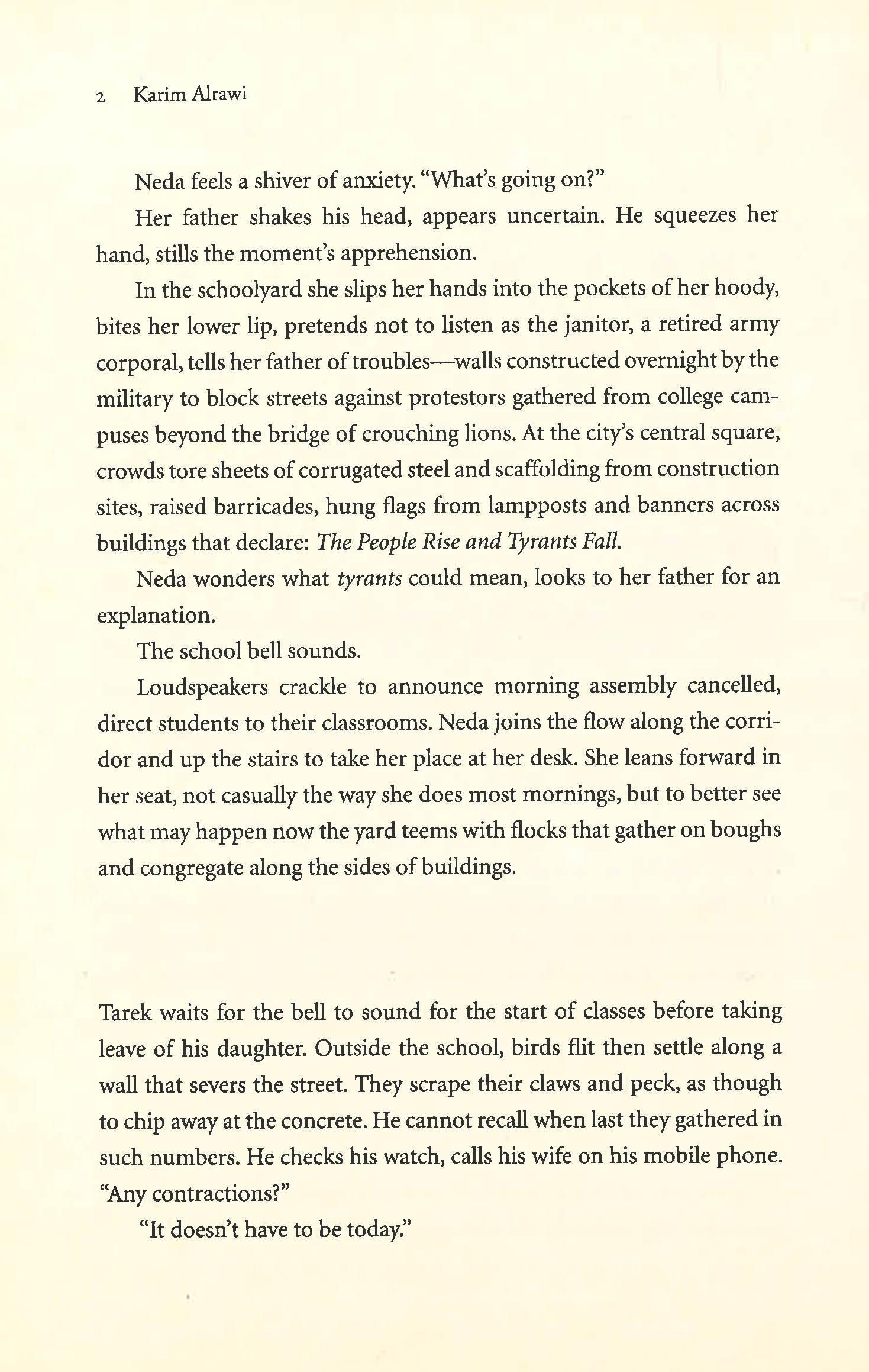 Tarek, a young father, watches as the city he lives in is mired in protests, hemmed in by barricades and strangely inundated by great flocks of birds. Facing the threat of police arrest, he flees with his nine-year-old daughter, Neda. He is forced to leave behind his pregnant wife, Mona, under the watchful eye of Omar, her deeply troubled and religious brother. Compounding the difficulties of these times, babies refuse to be born and mothers stop giving birth. As Tarek and Nada journey through villages razed by conflict toward a mountain refuge, they meet with travellers from Tarek?s past and his time as a political prisoner. The reunion reveals secrets that Tarek must come to terms with for his own and Neda?s sake. Ultimately, he must decide where this journey will take them and if he will ever be able to return home again. In the tradition of Salman Rushdie?s Midnight?s Children and Orhan Pamuk?s Snow, debut novelist Karim Alrawi deftly weaves an atmospheric, multi-layered story of intimate lives, informed by recent events and heightened by touches of magic realism, set against the wider canvas of historic events.