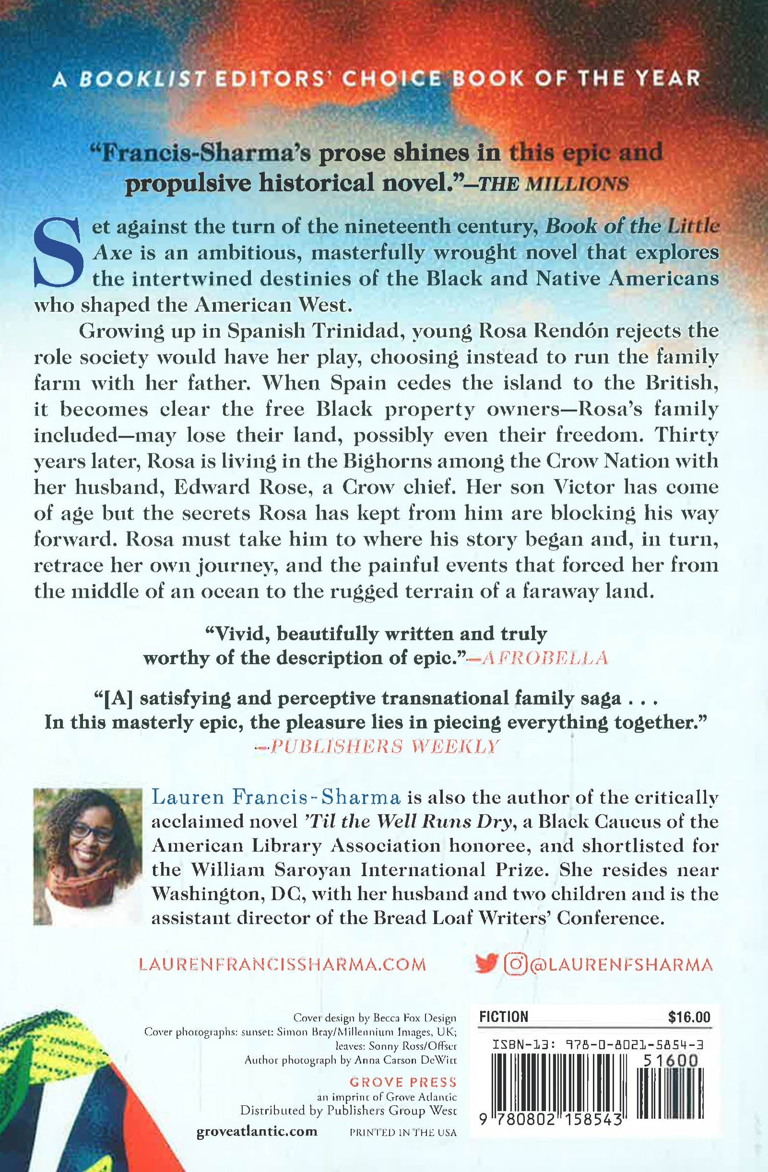 Ambitious and masterfully-wrought, Lauren Francis-Sharma’s Book of the Little Axe is an incredible journey, spanning decades and oceans from Trinidad to the American West during the tumultuous days of warring colonial powers and westward expansion.