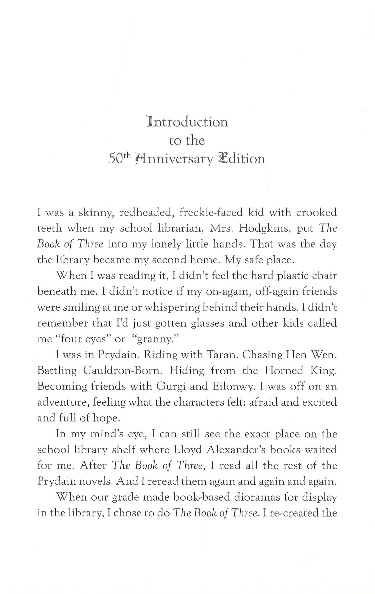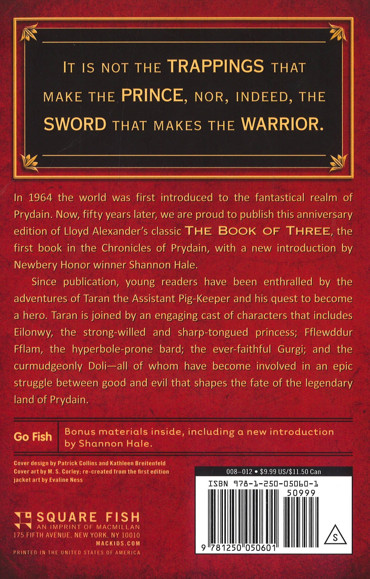 Henry Holt Books for Young Readers is proud to publish this 50th Anniversary Edition of Lloyd Alexander's classic The Book of Three, the first book in the Chronicles of Prydain, with a new introduction by Newbery Honor-winner Shannon Hale. This anniversary edition is filled with bonus materials, including an interview with Lloyd Alexander, a Prydain short story, the first chapter of the next Prydain book (The Black Cauldron, a Newbery Honor book), an author's note, and a pronunciation guide. Since The Book of Three was first published in 1964, young readers have been enthralled by the adventures of Taran the Assistant Pig-Keeper and his quest to become a hero. Taran is joined by an engaging cast of characters that includes Eilonwy, the strong-willed and sharp-tongued princess; Fflewddur Fflam, the hyperbole-prone bard; the ever-faithful Gurgi; and the curmudgeonly Doli--all of whom have become involved in an epic struggle between good and evil that shapes the fate of the legendary land of Prydain. This title has Common Core connections.