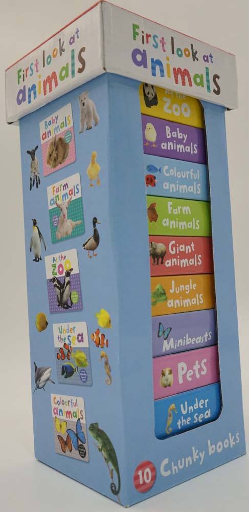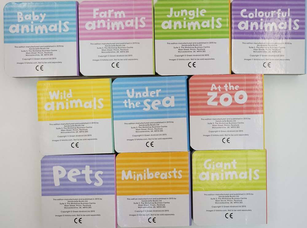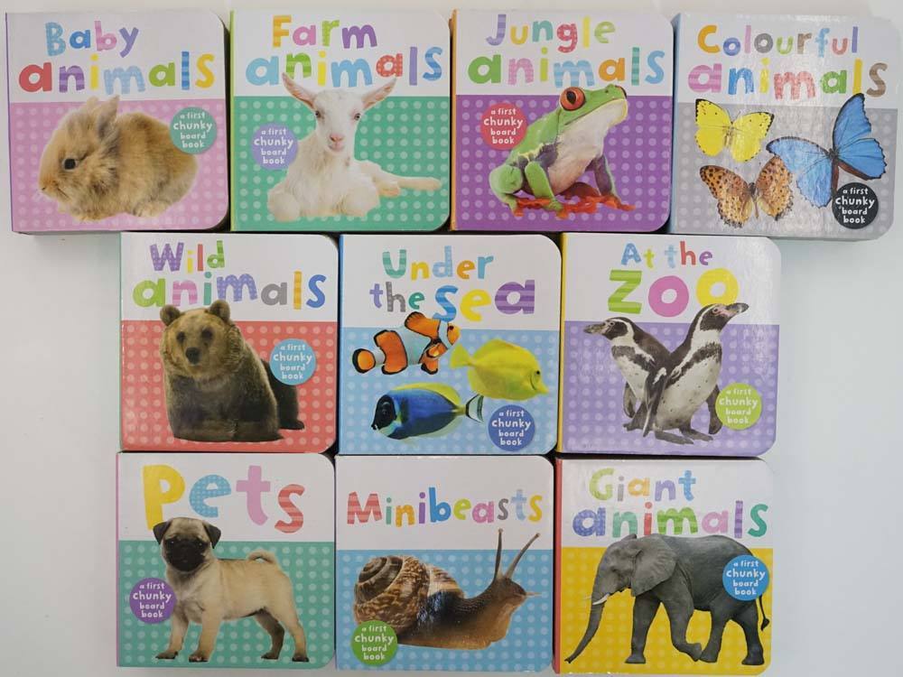 10 chunky books for babies and toddlers. Titles Included: Jungle Animals, Minibeasts, Wild Animals, Pets, Giant Animals, Baby Animals, Farm Animals, At the Zoo, Under the Sea and Colourful Animals.