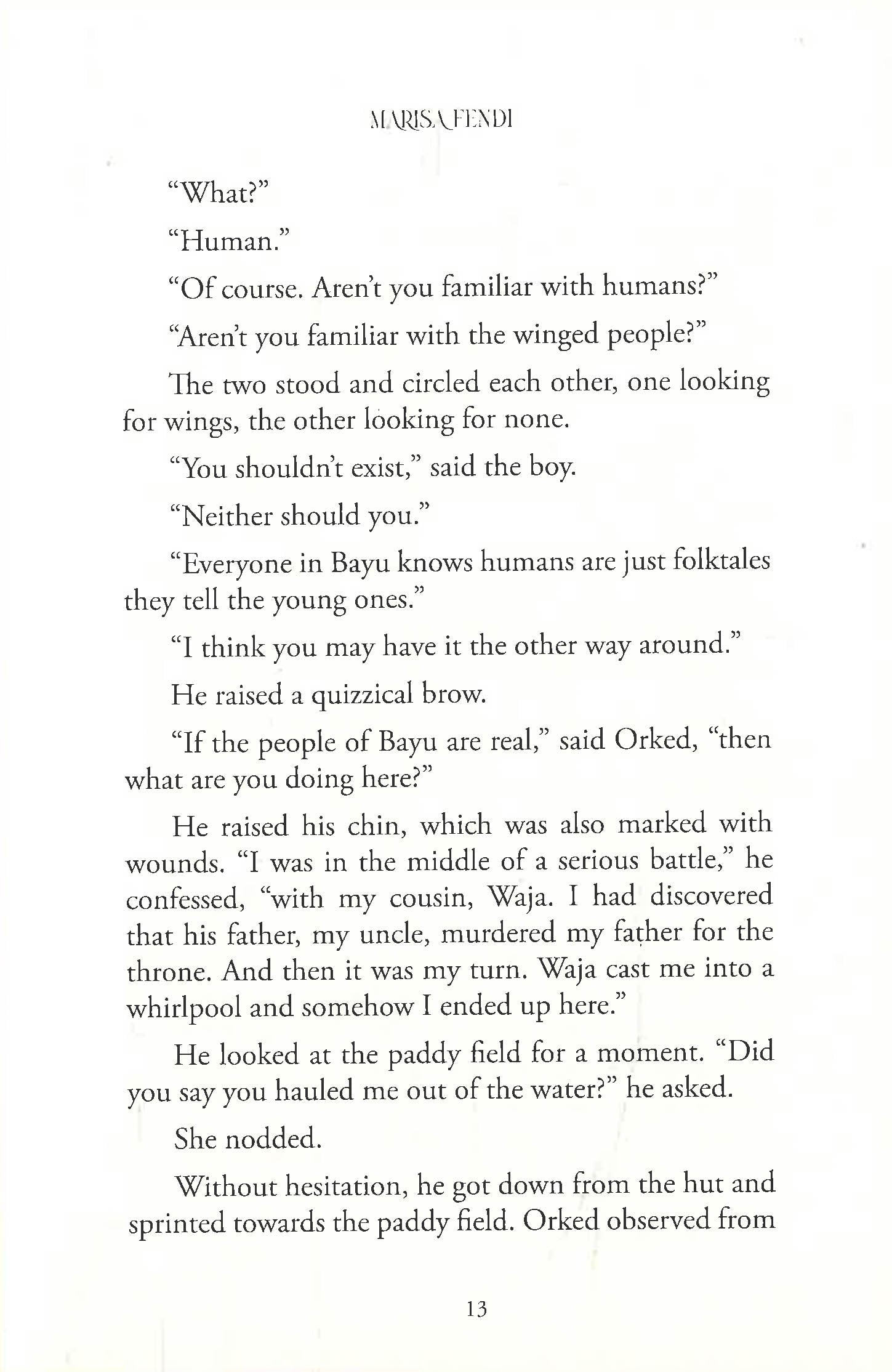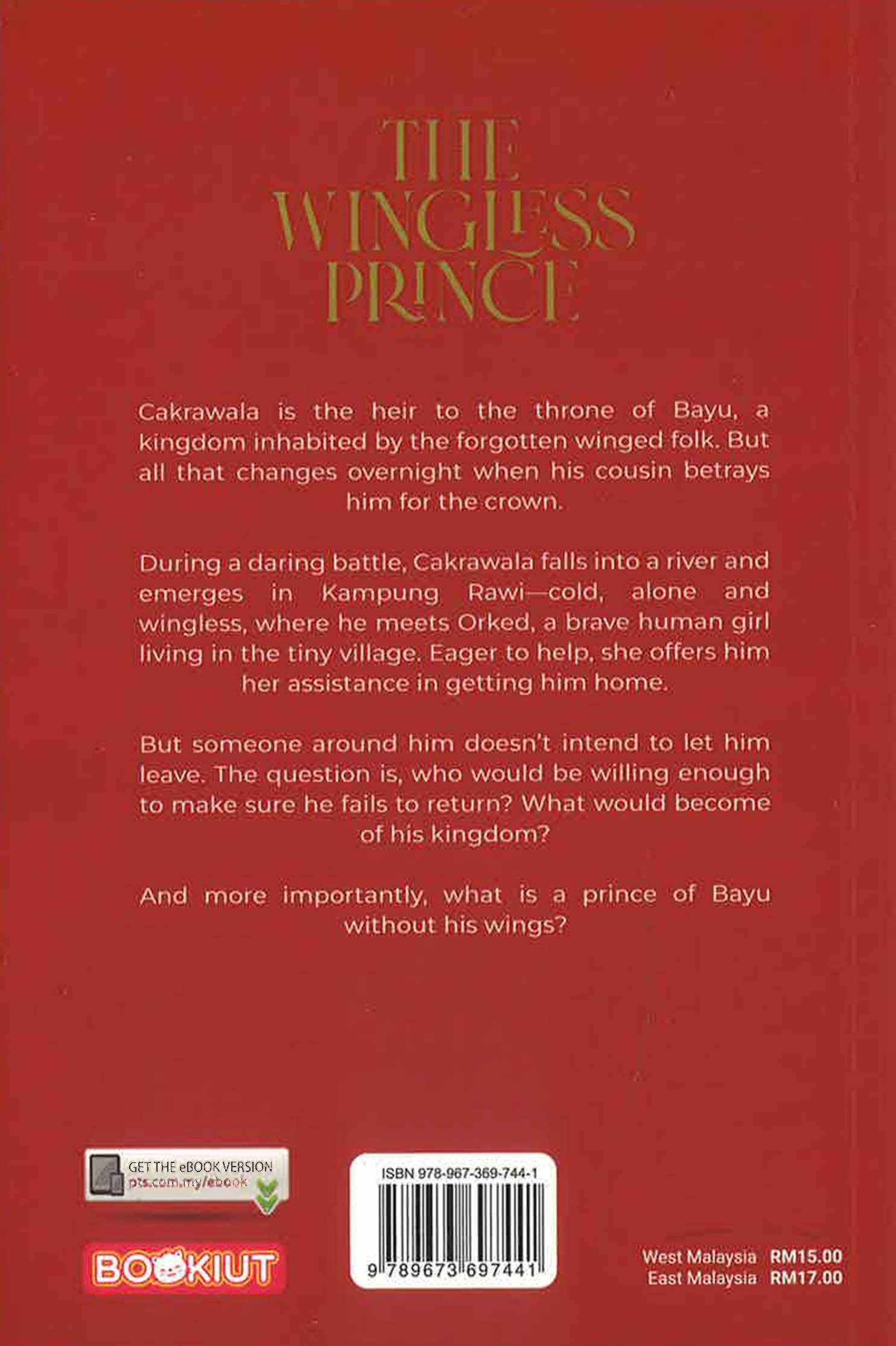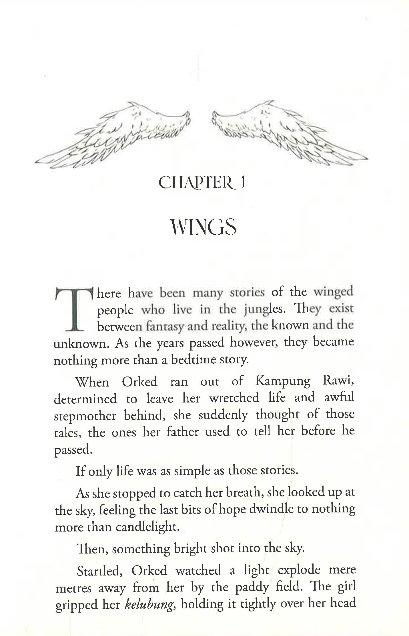 Cakrawala is the heir to the throne of Bayu, a kingdom inhabited by the forgotten winged folk. But all that changes overnight when his cousin betrays him for the crown. During a daring battle, Cakrawala falls into a river and emerges in Kampung Rawi—cold, alone, and wingless, where he meets Orked, a brave human girl living in the tiny village. Eager to help, she offers him her assistance in getting him home. But someone around him doesnt intend to let him leave. The question is, who would be willing enough to make sure he fails to return? What would become of his kingdom? And more importantly, what is a prince of Bayu without his wings?